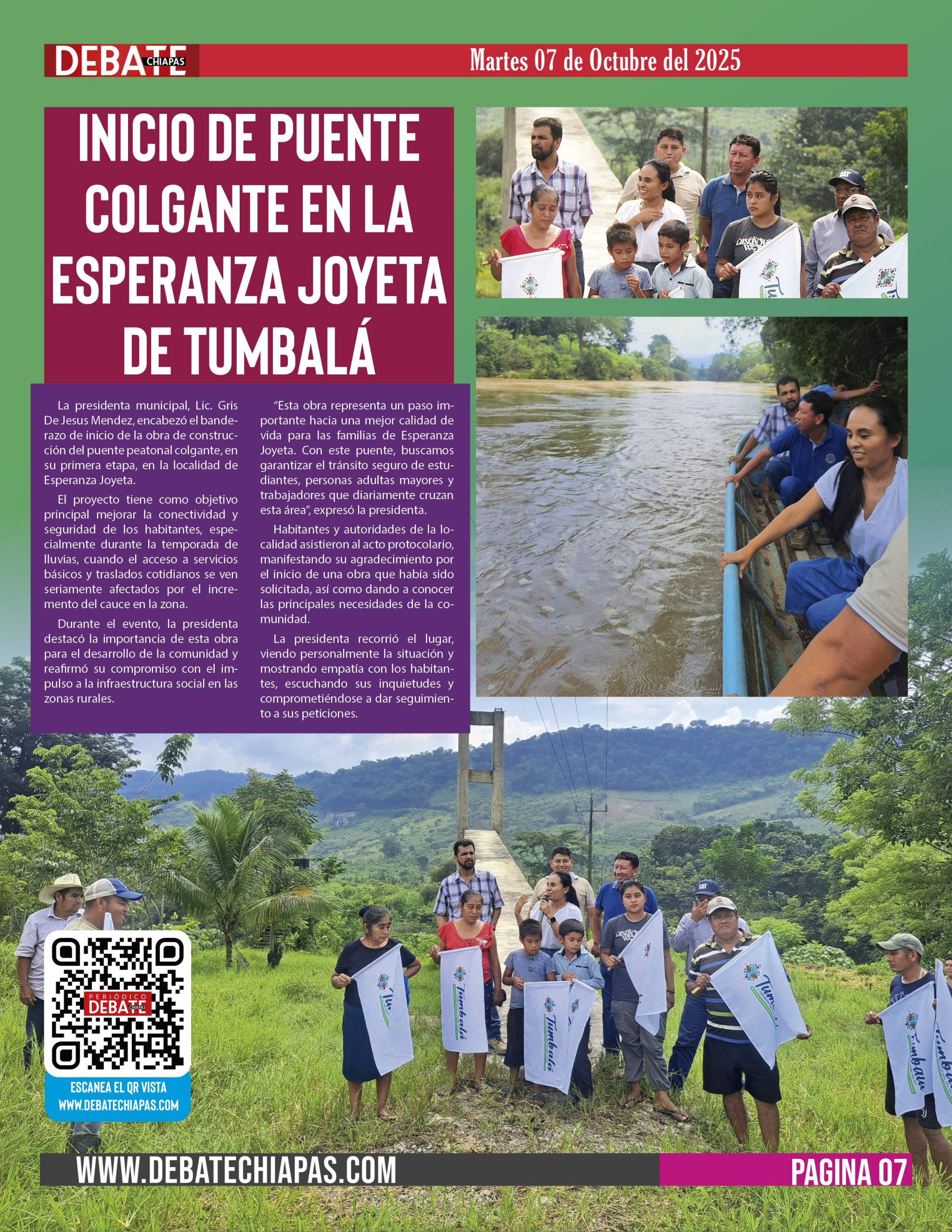 La presidenta municipal, Lic. Gris De Jesus Mendez, encabezó el banderazo de inicio de la obra de construcción del puente peatonal colgante, en su primera etapa, en la localidad de Esperanza Joyeta.