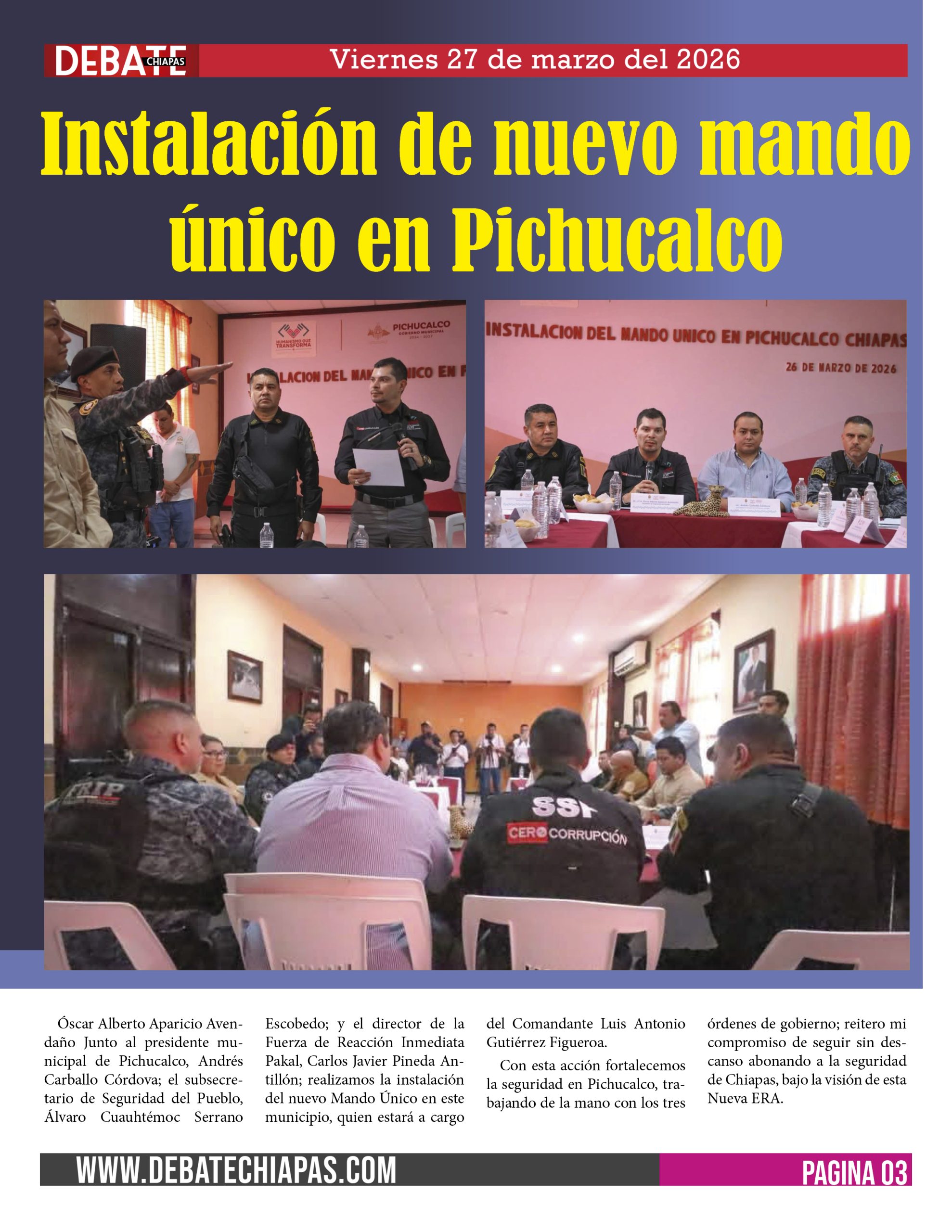 Óscar Alberto Aparicio Avendaño Junto al presidente municipal de Pichucalco, Andrés Carballo Córdova; el subsecretario de Seguridad del Pueblo, Álvaro Cuauhtémoc Serrano Escobedo; y el director de la Fuerza de Reacción Inmediata Pakal, Carlos Javier Pineda Antillón; realizamos la instalación del nuevo Mando Único en este municipio, quien estará a cargo del Comandante Luis Antonio Gutiérrez Figueroa.