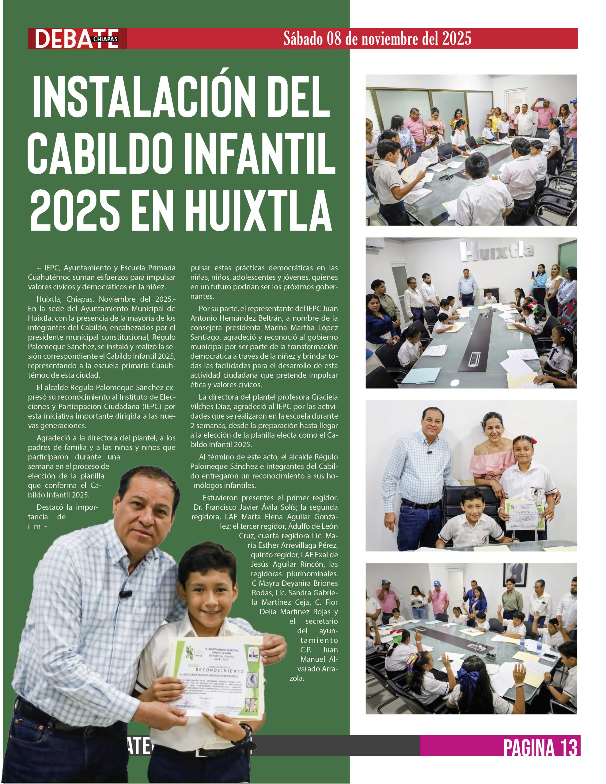 Huixtla, Chiapas. Noviembre del 2025.- En la sede del Ayuntamiento Municipal de Huixtla, con la presencia de la mayoría de los integrantes del Cabildo, encabezados por el presidente municipal constitucional, Régulo Palomeque Sánchez, se instaló y realizó la sesión correspondiente el Cabildo Infantil 2025, representando a la escuela primaria Cuauhtémoc de esta ciudad.