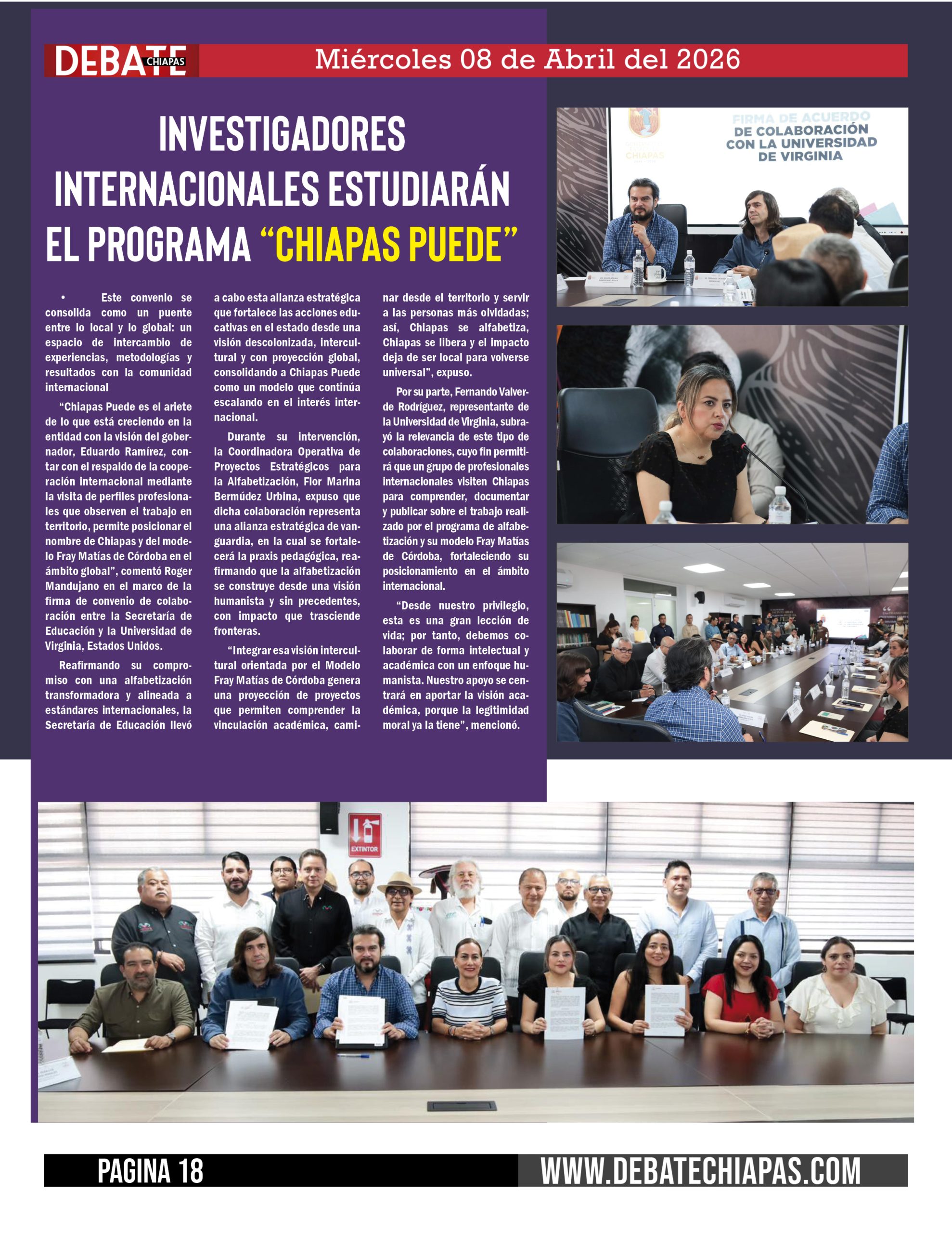 Por su parte, Fernando Valverde Rodríguez, representante de la Universidad de Virginia, subrayó la relevancia de este tipo de colaboraciones, cuyo fin permitirá que un grupo de profesionales internacionales visiten Chiapas para comprender, documentar y publicar sobre el trabajo realizado por el programa de alfabetización y su modelo Fray Matías de Córdoba, fortaleciendo su posicionamiento en el ámbito internacional.
