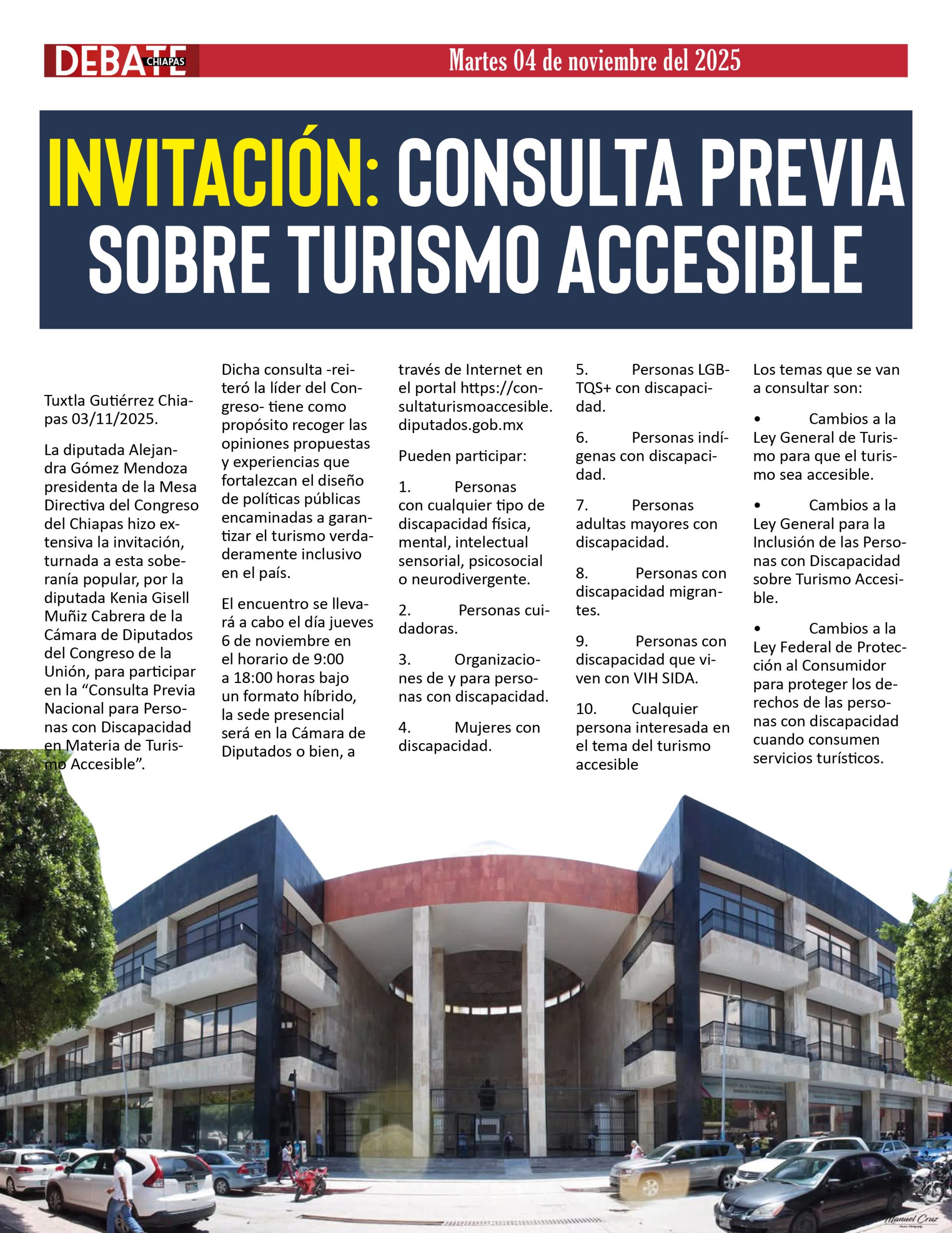La diputada Alejandra Gómez Mendoza presidenta de la Mesa Directiva del Congreso del Chiapas hizo extensiva la invitación, turnada a esta soberanía popular, por la diputada Kenia Gisell Muñiz Cabrera de la Cámara de Diputados del Congreso de la Unión, para participar  en la “Consulta Previa Nacional para Personas con Discapacidad en Materia de Turismo Accesible”.