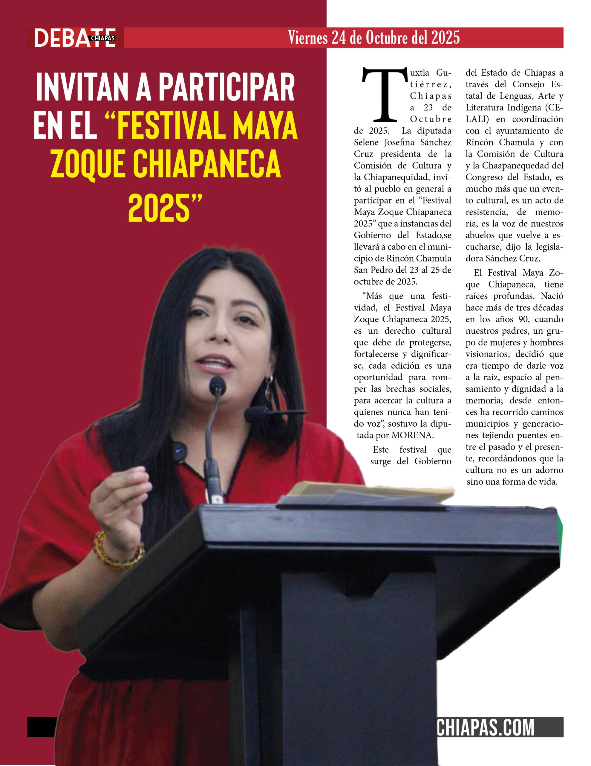 Tuxtla Gutiérrez, Chiapas a 23 de Octubre de 2025. La diputada Selene Josefina Sánchez Cruz presidenta de la Comisión de Cultura y la Chiapanequidad, invitó al pueblo en general a participar en el “Festival Maya Zoque Chiapaneca 2025” que a instancias del Gobierno del Estado,se llevará a cabo en el municipio de Rincón Chamula San Pedro del 23 al 25 de octubre de 2025.