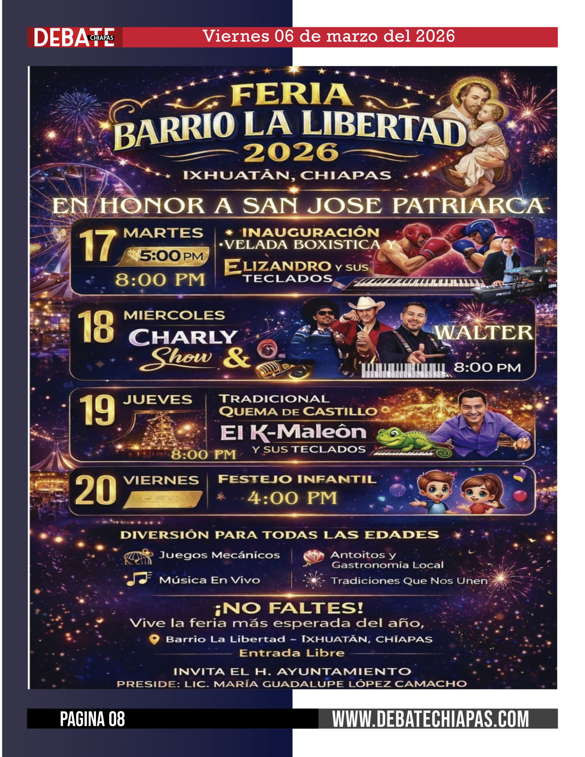Con gran entusiasmo te invitamos a vivir la Feria Barrio La Libertad 2026 en Ixhuatán, Chiapas, una celebración llena de cultura, música, diversión y tradición en honor a San José Patriarca. 🙏🎊