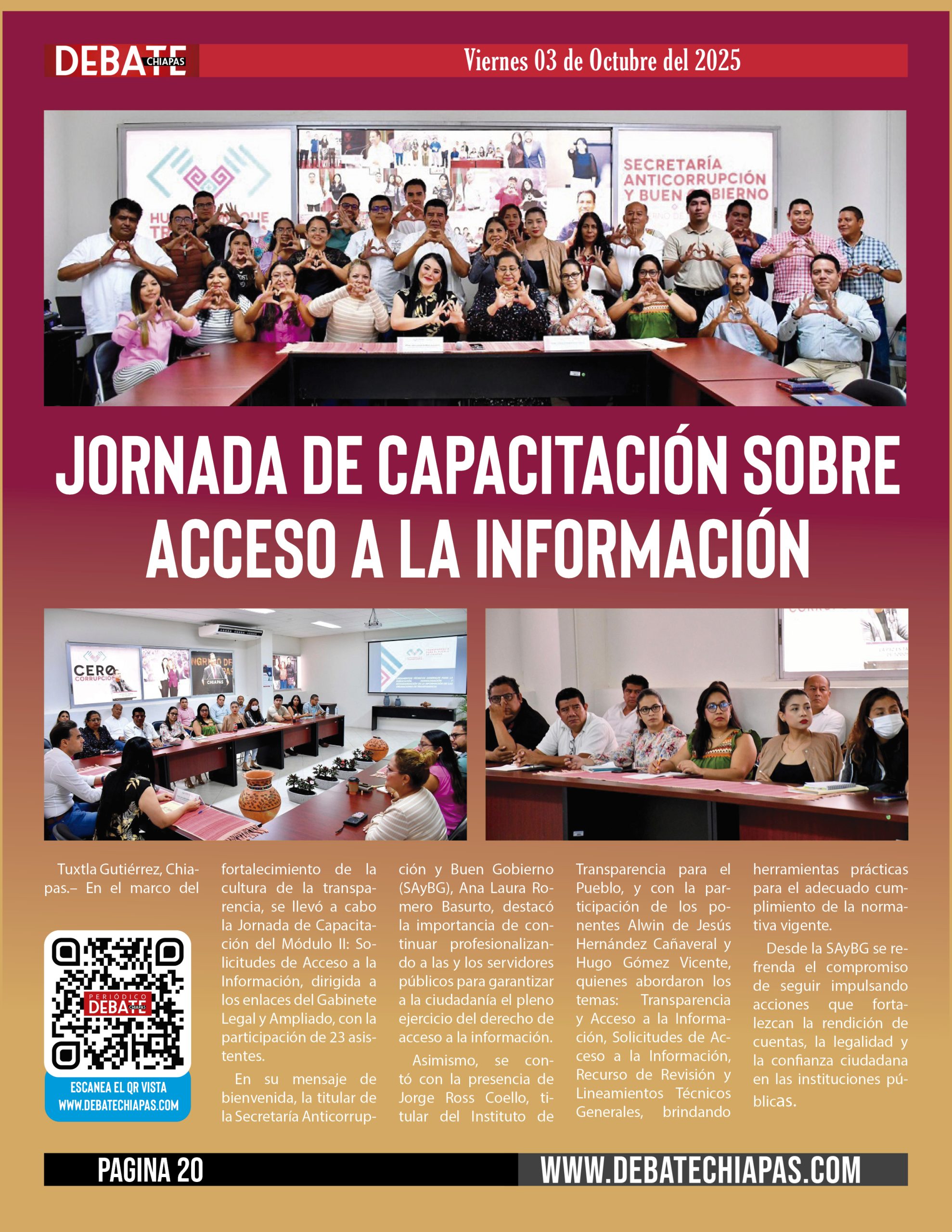 Tuxtla Gutiérrez, Chiapas.– En el marco del fortalecimiento de la cultura de la transparencia, se llevó a cabo la Jornada de Capacitación del Módulo II: Solicitudes de Acceso a la Información, dirigida a los enlaces del Gabinete Legal y Ampliado, con la participación de 23 asistentes.