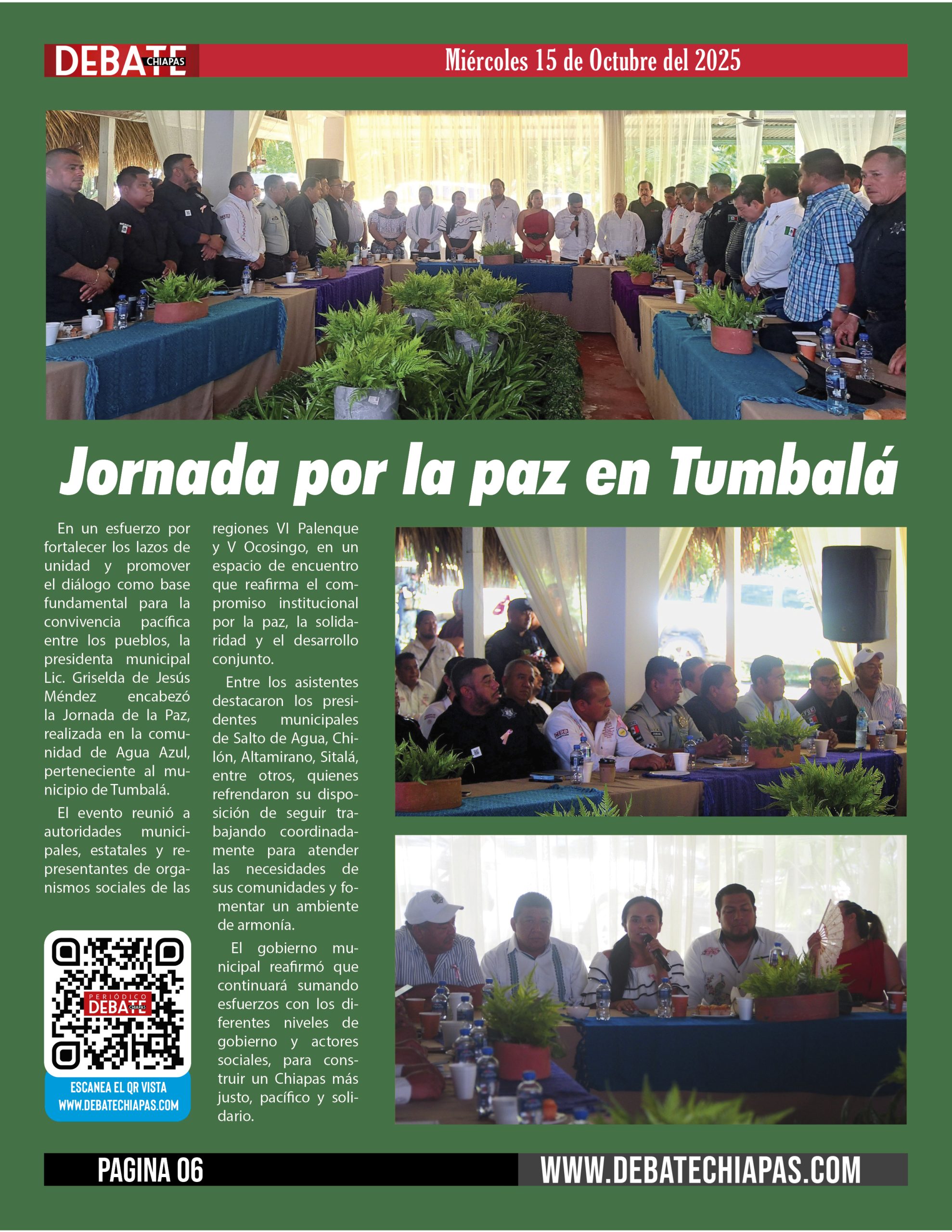 En un esfuerzo por fortalecer los lazos de unidad y promover el diálogo como base fundamental para la convivencia pacífica entre los pueblos, la presidenta municipal Lic. Griselda de Jesús Méndez encabezó la Jornada de la Paz, realizada en la comunidad de Agua Azul, perteneciente al municipio de Tumbalá.