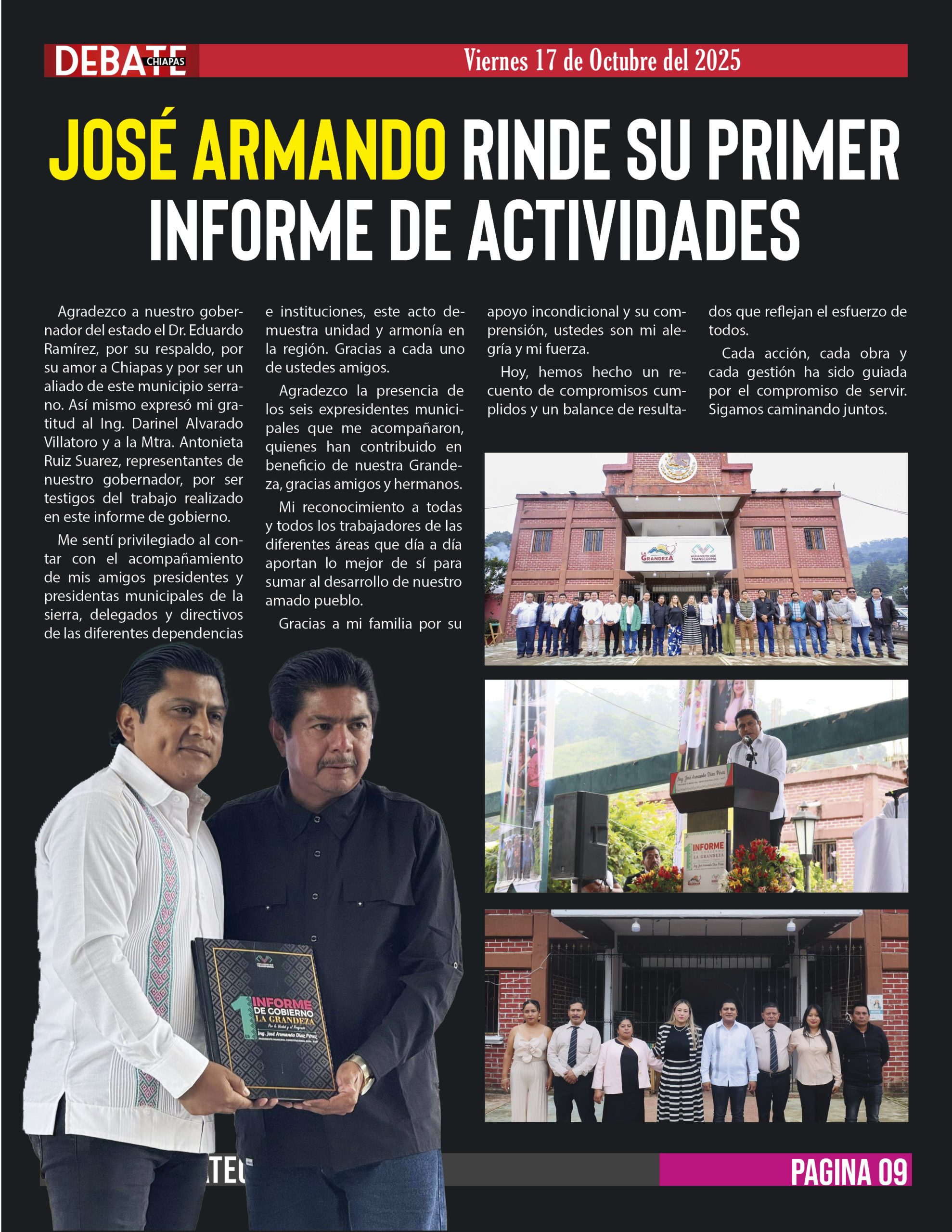 Agradezco a nuestro gobernador del estado el Dr. Eduardo Ramírez, por su respaldo, por su amor a Chiapas y por ser un aliado de este municipio serrano. Así mismo expresó mi gratitud al Ing. Darinel Alvarado Villatoro y a la Mtra. Antonieta Ruiz Suarez, representantes de nuestro gobernador, por ser testigos del trabajo realizado en este informe de gobierno.
