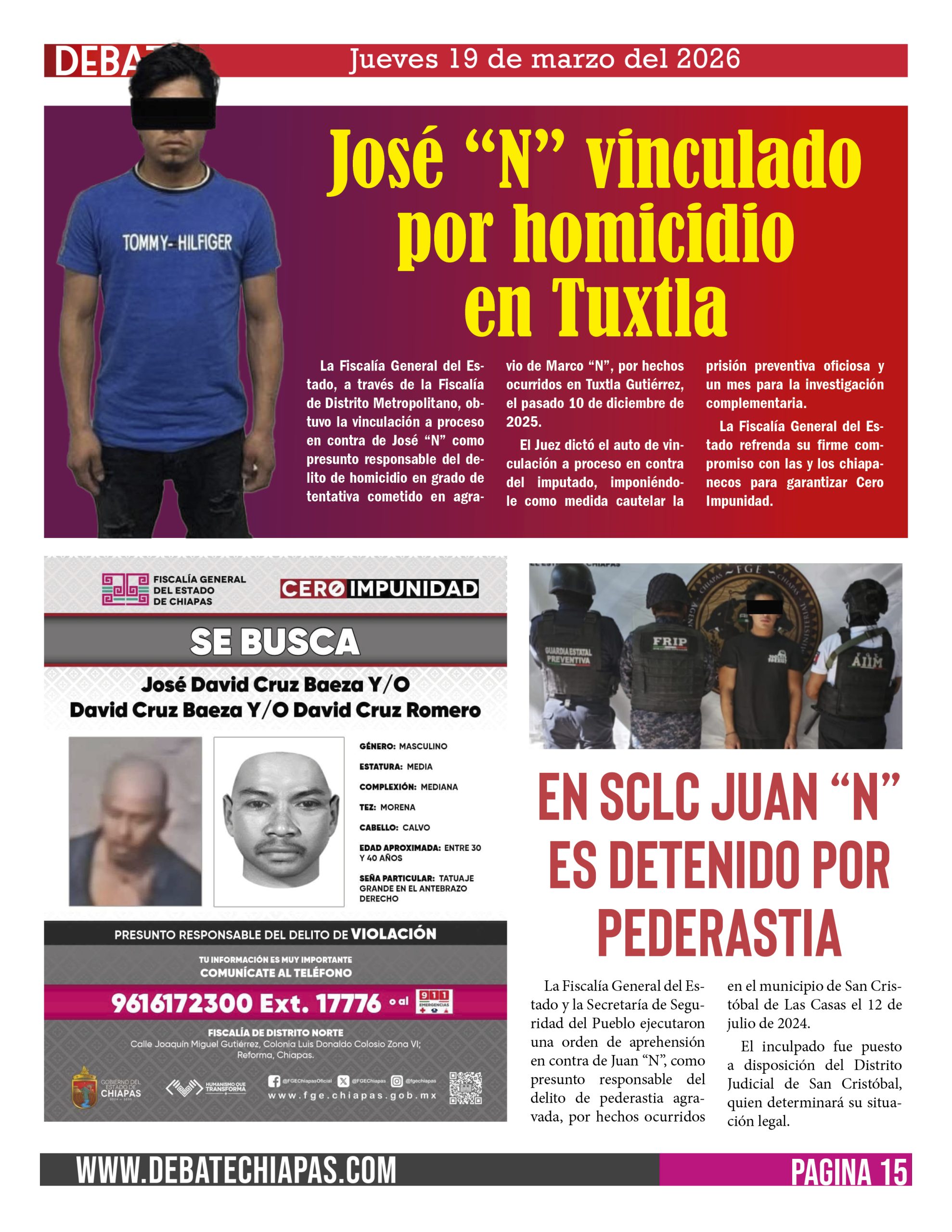 La Fiscalía General del Estado, a través de la Fiscalía de Distrito Metropolitano, obtuvo la vinculación a proceso en contra de José “N” como presunto responsable del delito de homicidio en grado de tentativa cometido en agravio de Marco “N”, por hechos ocurridos en Tuxtla Gutiérrez, el pasado 10 de diciembre de 2025.