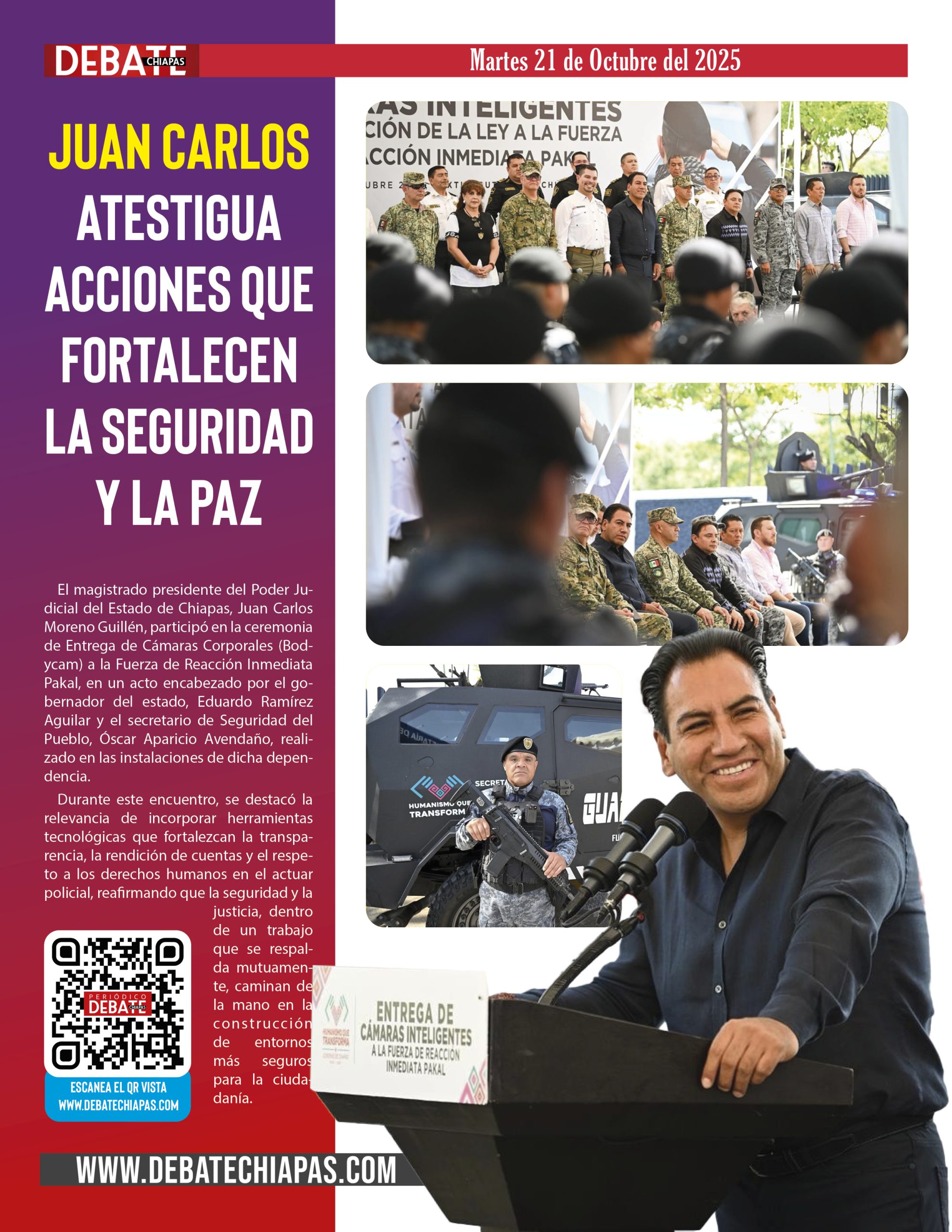 El magistrado presidente del Poder Judicial del Estado de Chiapas, Juan Carlos Moreno Guillén, participó en la ceremonia de Entrega de Cámaras Corporales (Bodycam) a la Fuerza de Reacción Inmediata Pakal, en un acto encabezado por el gobernador del estado, Eduardo Ramírez Aguilar y el secretario de Seguridad del Pueblo, Óscar Aparicio Avendaño, realizado en las instalaciones de dicha dependencia.