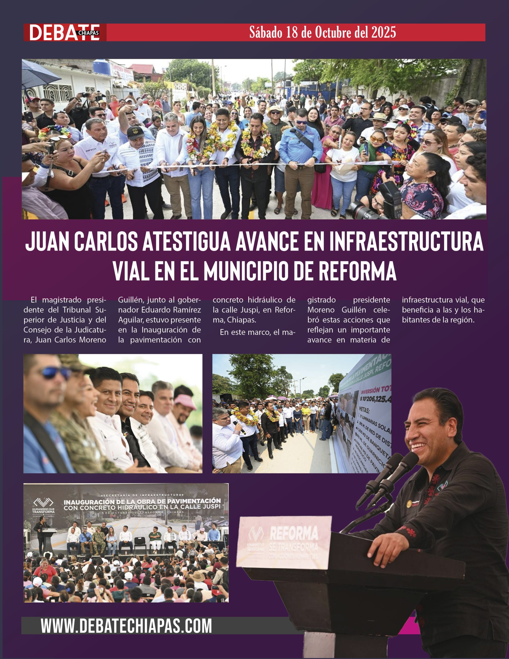 El magistrado presidente del Tribunal Superior de Justicia y del Consejo de la Judicatura, Juan Carlos Moreno Guillén, junto al gobernador Eduardo Ramírez Aguilar, estuvo presente en la Inauguración de la pavimentación con concreto hidráulico de la calle Juspi, en Reforma, Chiapas.