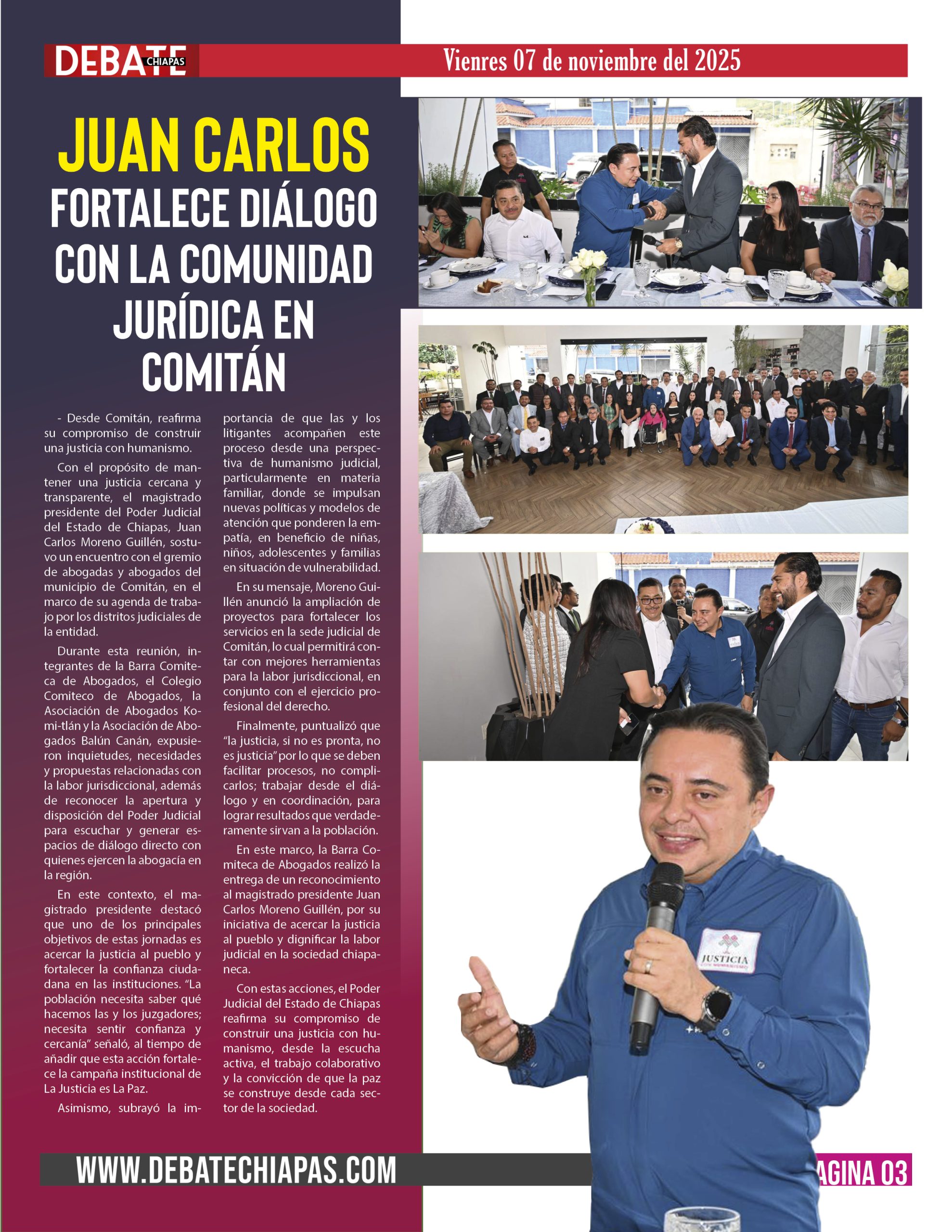 Con el propósito de mantener una justicia cercana y transparente, el magistrado presidente del Poder Judicial del Estado de Chiapas, Juan Carlos Moreno Guillén, sostuvo un encuentro con el gremio de abogadas y abogados del municipio de Comitán, en el marco de su agenda de trabajo por los distritos judiciales de la entidad.