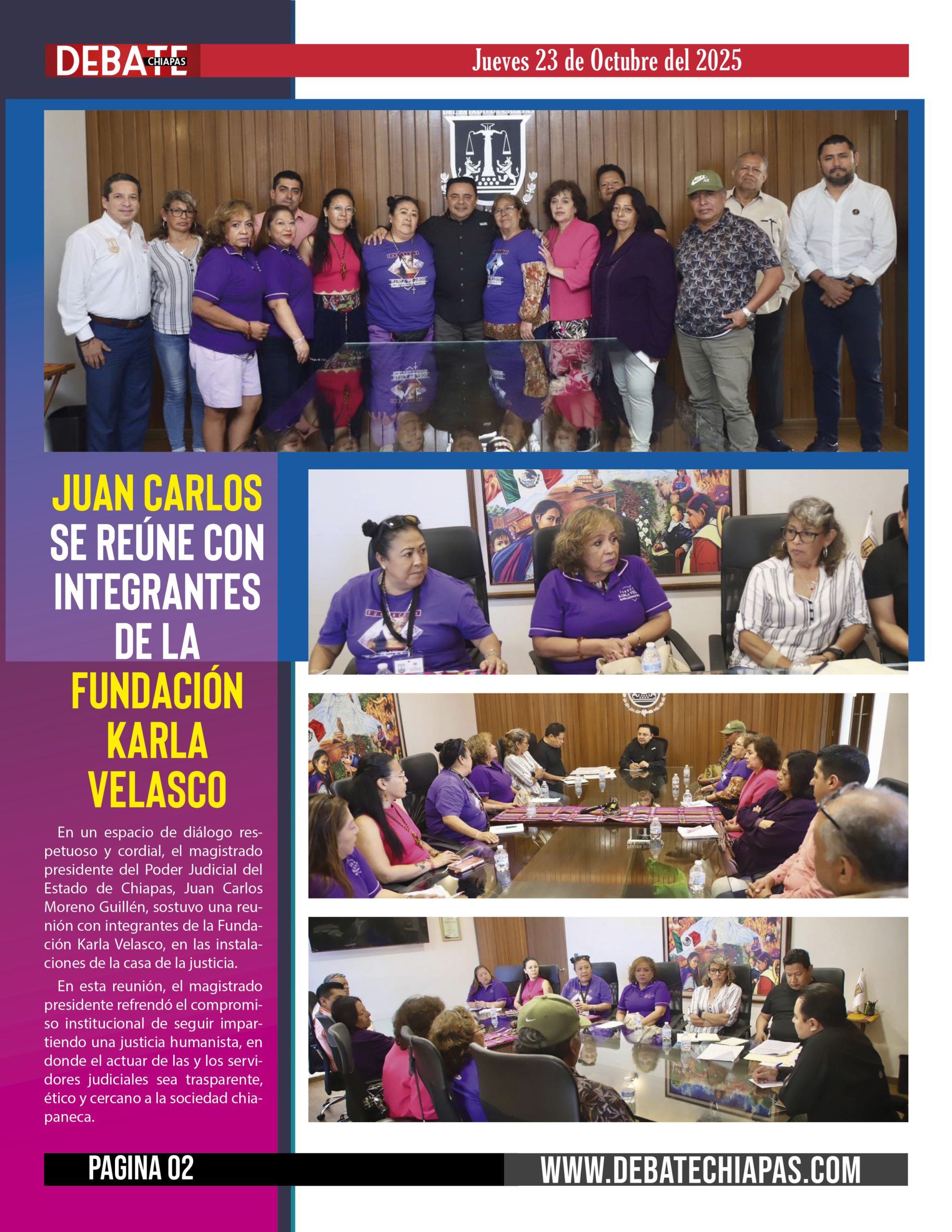 En un espacio de diálogo respetuoso y cordial, el magistrado presidente del Poder Judicial del Estado de Chiapas, Juan Carlos Moreno Guillén, sostuvo una reunión con integrantes de la Fundación Karla Velasco, en las instalaciones de la casa de la justicia.