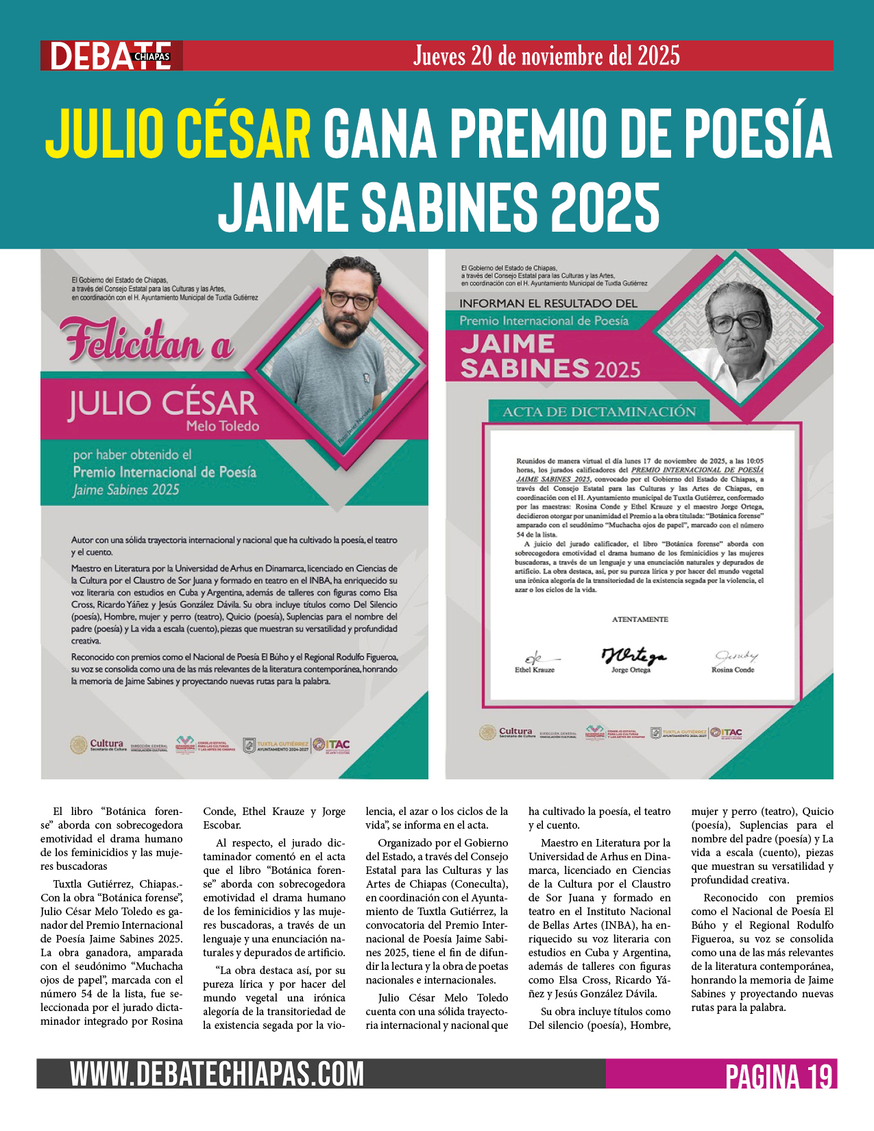 Tuxtla Gutiérrez, Chiapas.- Con la obra “Botánica forense”, Julio César Melo Toledo es ganador del Premio Internacional de Poesía Jaime Sabines 2025. La obra ganadora, amparada con el seudónimo “Muchacha ojos de papel”, marcada con el número 54 de la lista, fue seleccionada por el jurado dictaminador integrado por Rosina Conde, Ethel Krauze y Jorge Escobar.