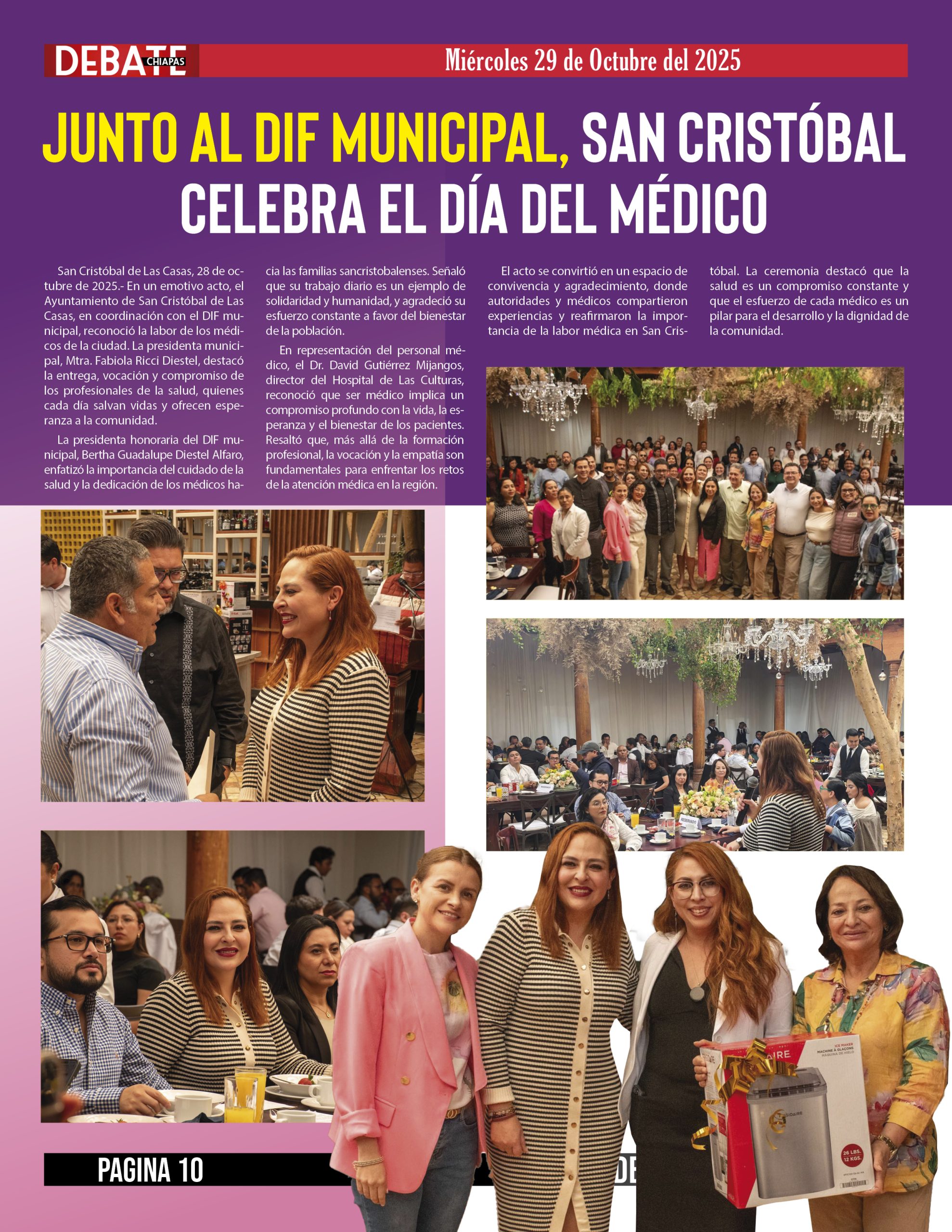 San Cristóbal de Las Casas, 28 de octubre de 2025.- En un emotivo acto, el Ayuntamiento de San Cristóbal de Las Casas, en coordinación con el DIF municipal, reconoció la labor de los médicos de la ciudad. La presidenta municipal, Mtra. Fabiola Ricci Diestel, destacó la entrega, vocación y compromiso de los profesionales de la salud, quienes cada día salvan vidas y ofrecen esperanza a la comunidad.