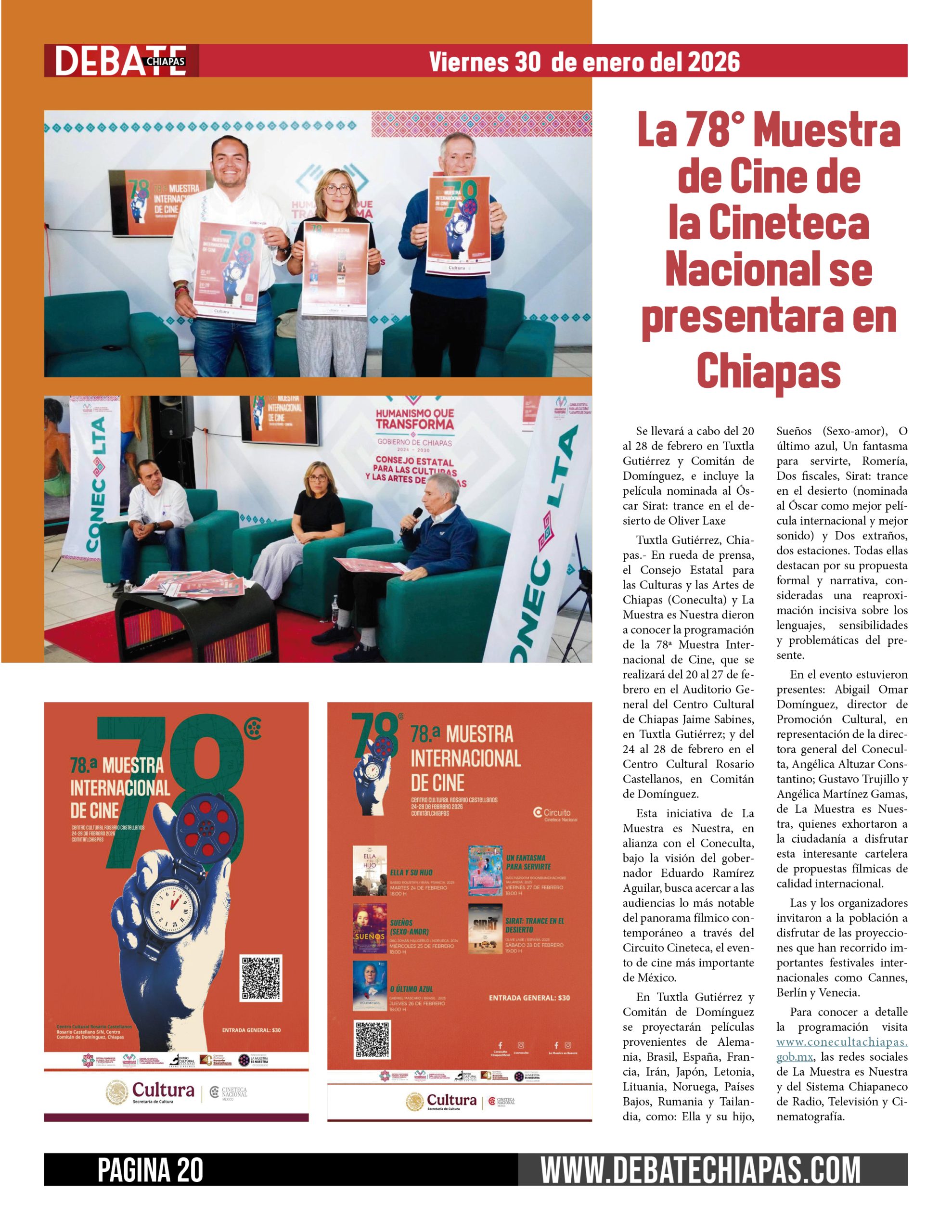 Tuxtla Gutiérrez, Chiapas.- En rueda de prensa, el Consejo Estatal para las Culturas y las Artes de Chiapas (Coneculta) y La Muestra es Nuestra dieron a conocer la programación de la 78ª Muestra Internacional de Cine, que se realizará del 20 al 27 de febrero en el Auditorio General del Centro Cultural de Chiapas Jaime Sabines, en Tuxtla Gutiérrez; y del 24 al 28 de febrero en el Centro Cultural Rosario Castellanos, en Comitán de Domínguez.