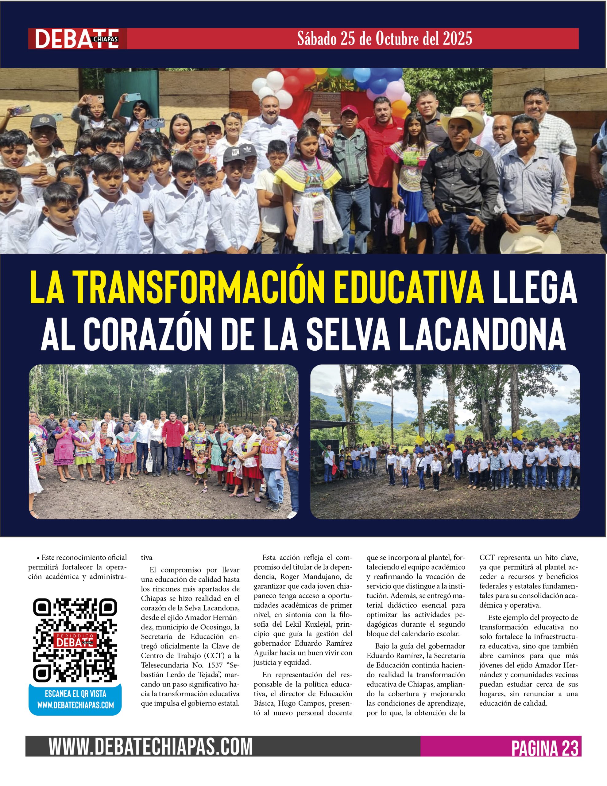 El compromiso por llevar una educación de calidad hasta los rincones más apartados de Chiapas se hizo realidad en el corazón de la Selva Lacandona, desde el ejido Amador Hernández, municipio de Ocosingo, la Secretaría de Educación entregó oficialmente la Clave de Centro de Trabajo (CCT) a la Telesecundaria No. 1537 “Sebastián Lerdo de Tejada”, marcando un paso significativo hacia la transformación educativa que impulsa el gobierno estatal.