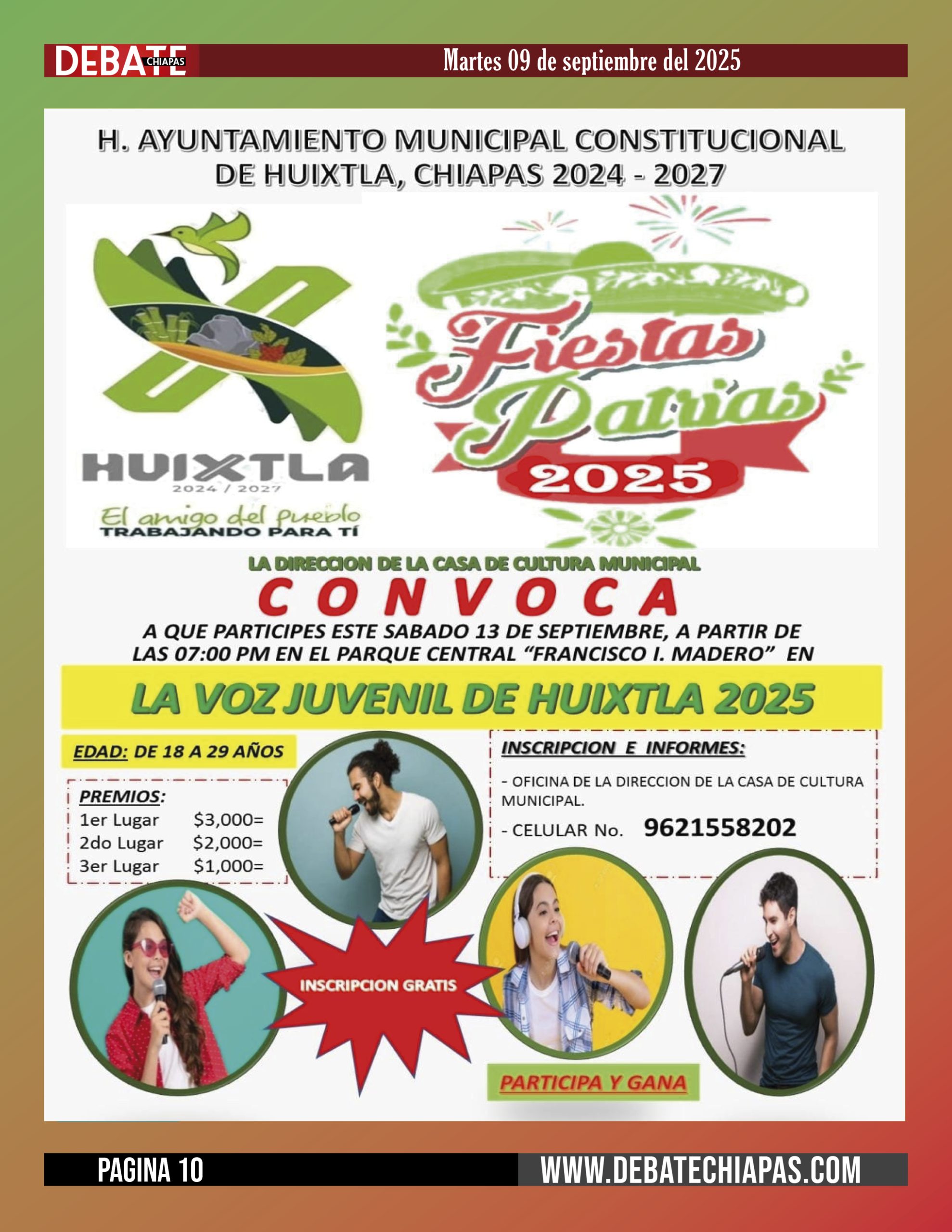 La Dirección de la Casa de la Cultura Municipal, a cargo del Lic. Carlos Alberto López Gómez, invita a jóvenes de 18 a 29 años a participar en el concurso «La Voz Juvenil de Huixtla 2025» con motivo de las Fiestas Patrias.
