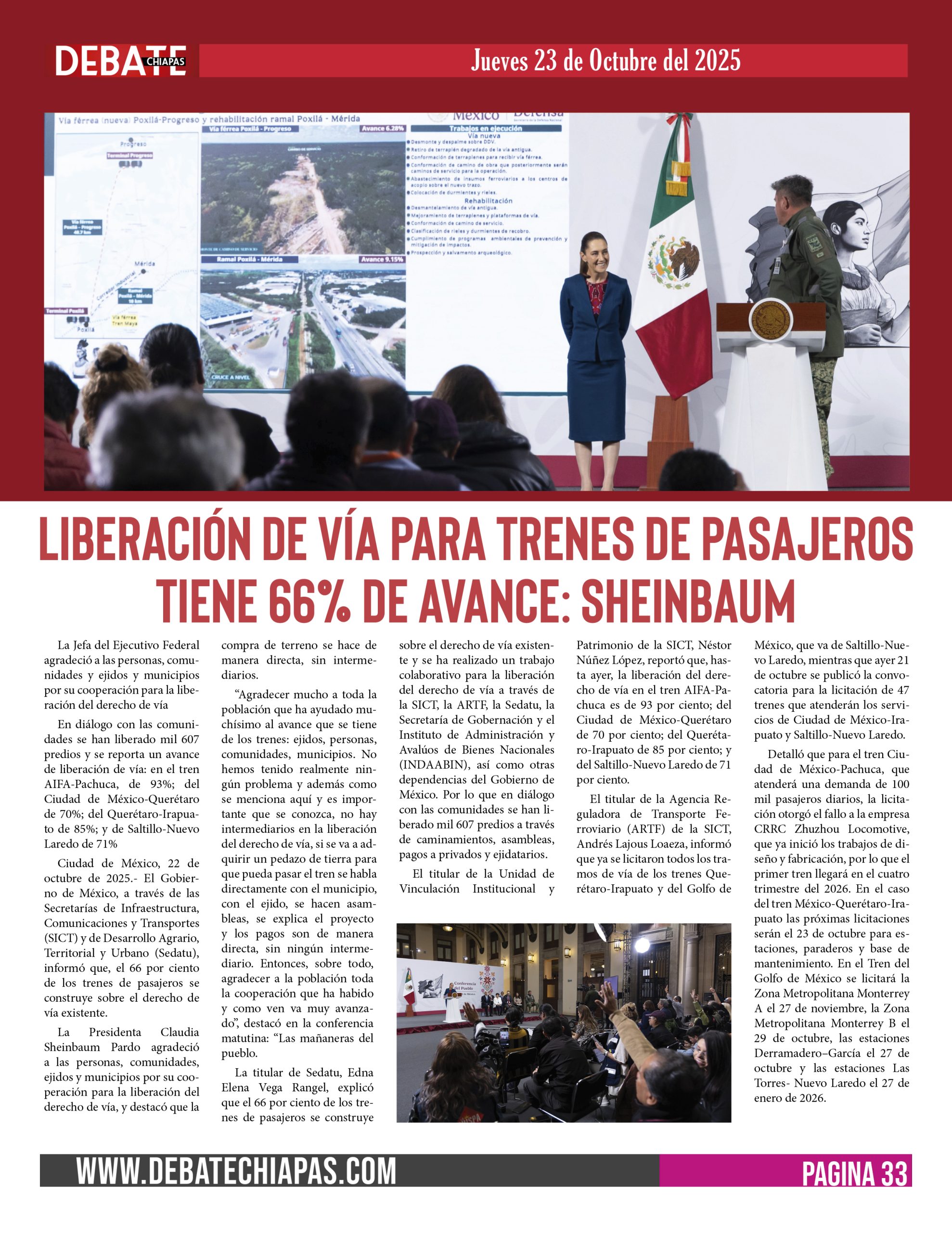 El titular de la Unidad de Vinculación Institucional y Patrimonio de la SICT, Néstor Núñez López, reportó que, hasta ayer, la liberación del derecho de vía en el tren AIFA-Pachuca es de 93 por ciento; del Ciudad de México-Querétaro de 70 por ciento; del Querétaro-Irapuato de 85 por ciento; y del Saltillo-Nuevo Laredo de 71 por ciento.