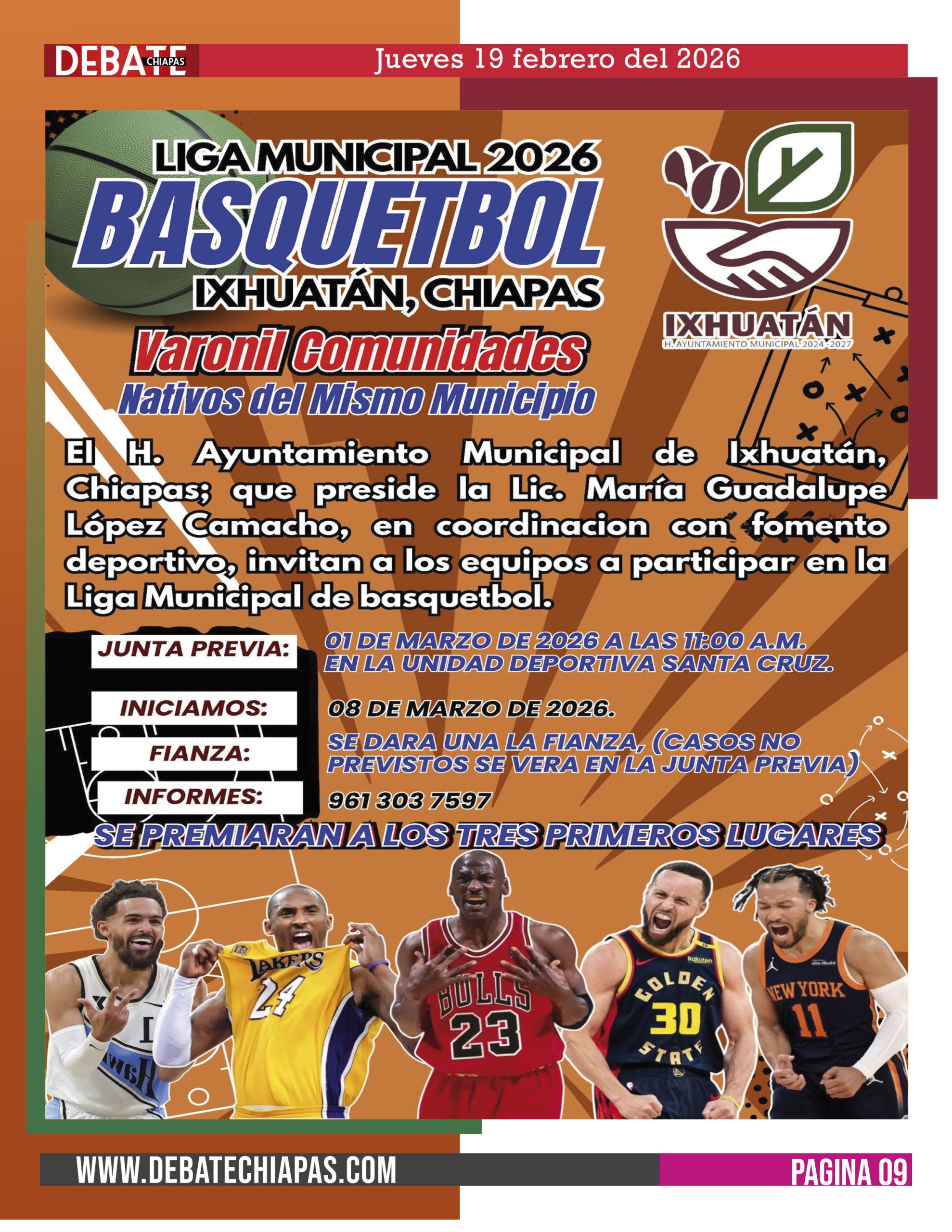El H. Ayuntamiento Municipal de Ixhuatán, Chiapas que Preside la Lic. María Guadalupe López Camacho, en coordinación con el área de Fomento Deportivo, invita a los equipos  participar en la Liga Municipal de Basquetbol categoría Varonil Comunidades Nativos del Mismo Municipio.