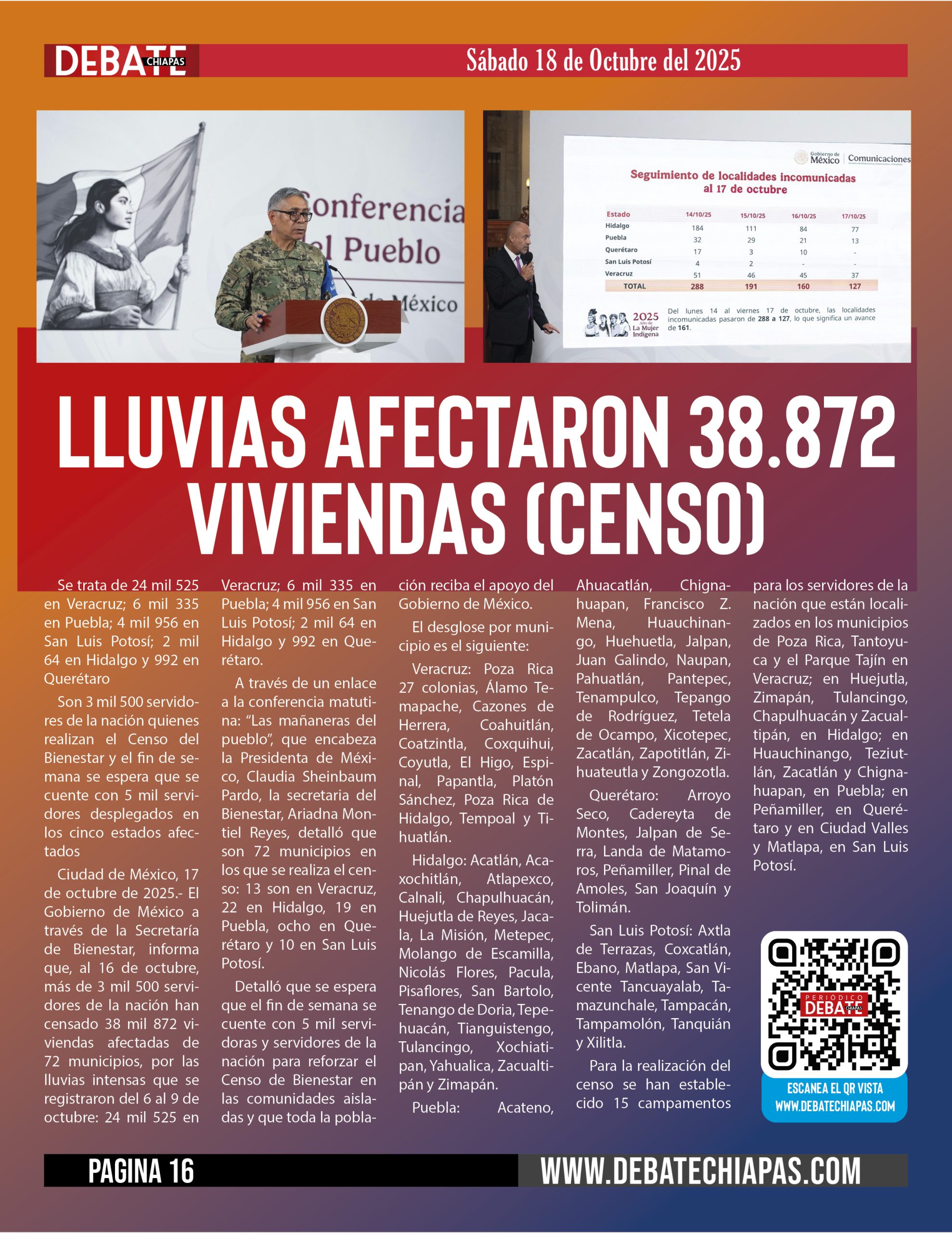 Ciudad de México, 17 de octubre de 2025.- El Gobierno de México a través de la Secretaría de Bienestar, informa que, al 16 de octubre, más de 3 mil 500 servidores de la nación han censado 38 mil 872 viviendas afectadas de 72 municipios, por las lluvias intensas que se registraron del 6 al 9 de octubre: 24 mil 525 en Veracruz; 6 mil 335 en Puebla; 4 mil 956 en San Luis Potosí; 2 mil 64 en Hidalgo y 992 en Querétaro.