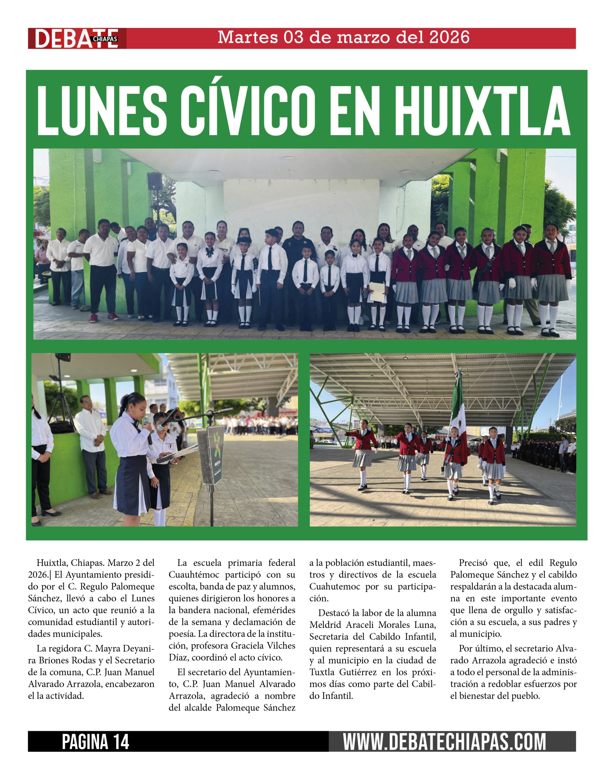 Huixtla, Chiapas. Marzo 2 del 2026.| El Ayuntamiento presidido por el C. Regulo Palomeque Sánchez, llevó a cabo el Lunes Cívico, un acto que reunió a la comunidad estudiantil y autoridades municipales.