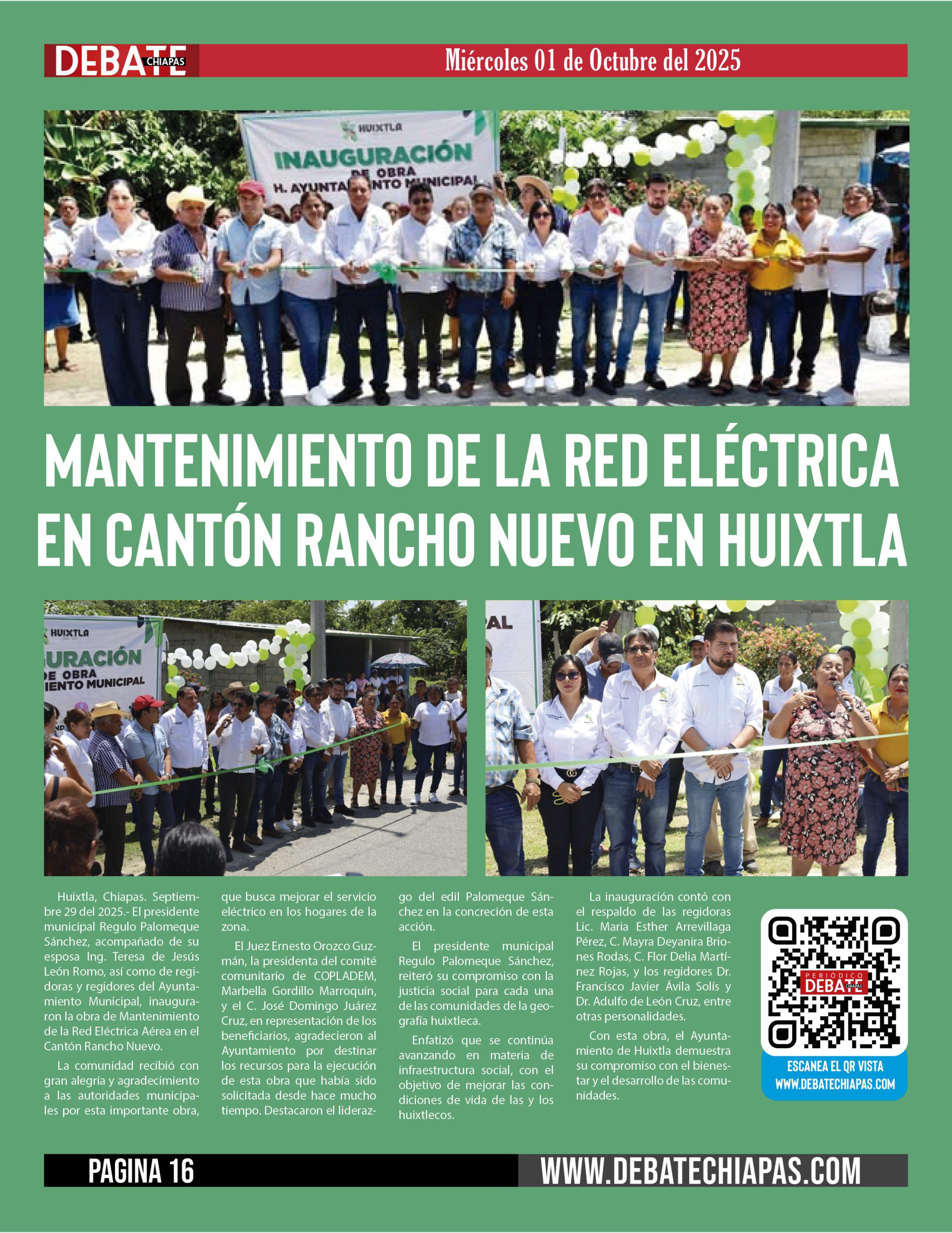 Huixtla, Chiapas. Septiembre 29 del 2025.- El presidente municipal Regulo Palomeque Sánchez, acompañado de su esposa Ing. Teresa de Jesús León Romo, así como de regidoras y regidores del Ayuntamiento Municipal, inauguraron la obra de Mantenimiento de la Red Eléctrica Aérea en el Cantón Rancho Nuevo.