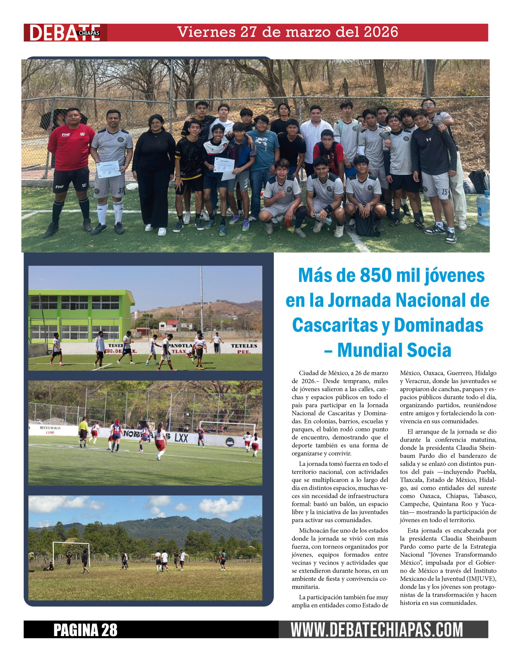 Ciudad de México, a 26 de marzo de 2026.– Desde temprano, miles de jóvenes salieron a las calles, canchas y espacios públicos en todo el país para participar en la Jornada Nacional de Cascaritas y Dominadas. En colonias, barrios, escuelas y parques, el balón rodó como punto de encuentro, demostrando que el deporte también es una forma de organizarse y convivir.