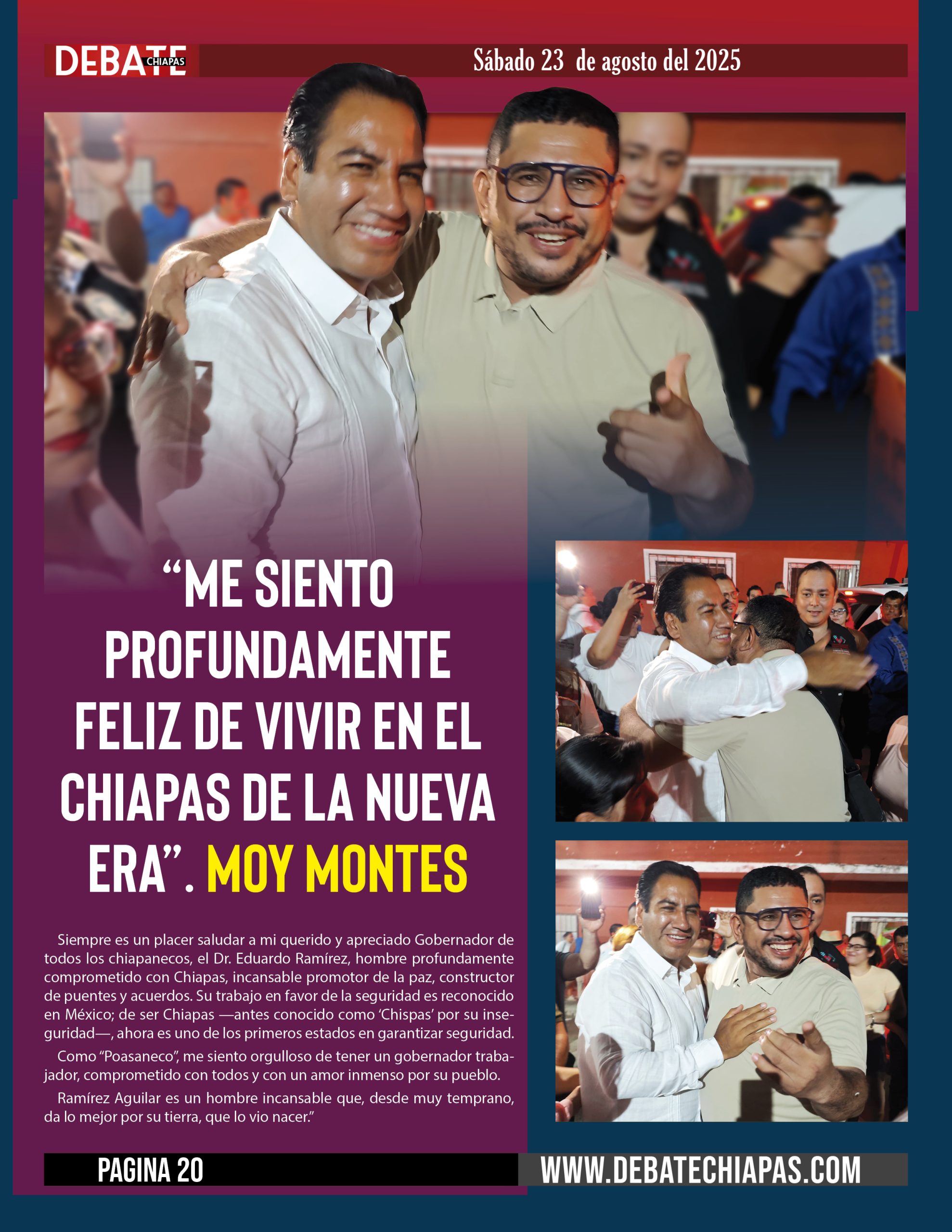 Siempre es un placer saludar a mi querido y apreciado Gobernador de todos los chiapanecos, el Dr. Eduardo Ramírez, hombre profundamente comprometido con Chiapas, incansable promotor de la paz, constructor de puentes y acuerdos. Su trabajo en favor de la seguridad es reconocido en México; de ser Chiapas —antes conocido como ‘Chispas’ por su inseguridad—, ahora es uno de los primeros estados en garantizar seguridad.