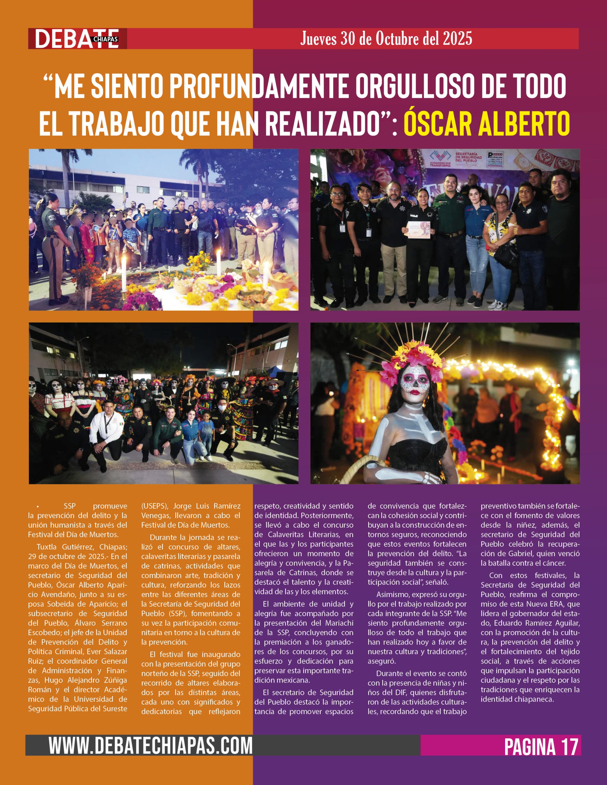 Tuxtla Gutiérrez, Chiapas; 29 de octubre de 2025.- En el marco del Día de Muertos, el secretario de Seguridad del Pueblo, Óscar Alberto Aparicio Avendaño, junto a su esposa Sobeida de Aparicio; el subsecretario de Seguridad del Pueblo, Álvaro Serrano Escobedo; el jefe de la Unidad de Prevención del Delito y Política Criminal, Ever Salazar Ruiz; el coordinador General de Administración y Finanzas, Hugo Alejandro Zúñiga Román y el director Académico de la Universidad de Seguridad Pública del Sureste (USEPS), Jorge Luis Ramírez Venegas, llevaron a cabo el Festival de Día de Muertos.