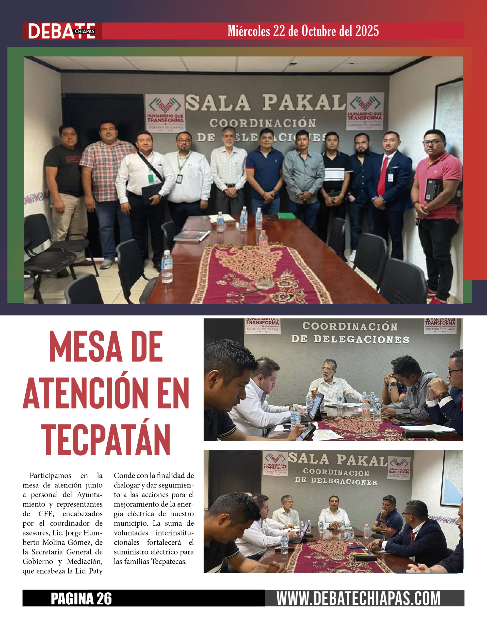 Participamos en la mesa de atención junto a personal del Ayuntamiento y representantes de CFE, encabezados por el coordinador de asesores, Lic. Jorge Humberto Molina Gómez, de la Secretaría General de Gobierno y Mediación, que encabeza la Lic. Paty Conde con la finalidad de dialogar y dar seguimiento a las acciones para el mejoramiento de la energía eléctrica de nuestro municipio. La suma de voluntades interinstitucionales fortalecerá el suministro eléctrico para las familias Tecpatecas.
