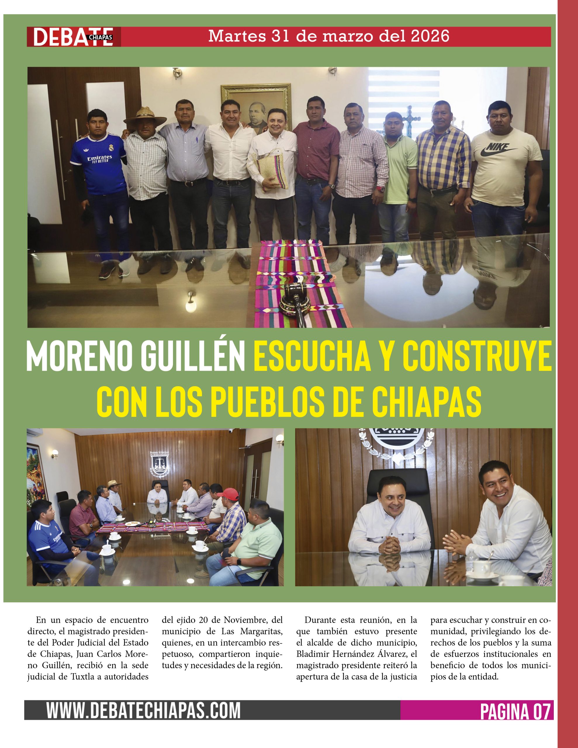 En un espacio de encuentro directo, el magistrado presidente del Poder Judicial del Estado de Chiapas, Juan Carlos Moreno Guillén, recibió en la sede judicial de Tuxtla a autoridades del ejido 20 de Noviembre, del municipio de Las Margaritas, quienes, en un intercambio respetuoso, compartieron inquietudes y necesidades de la región.