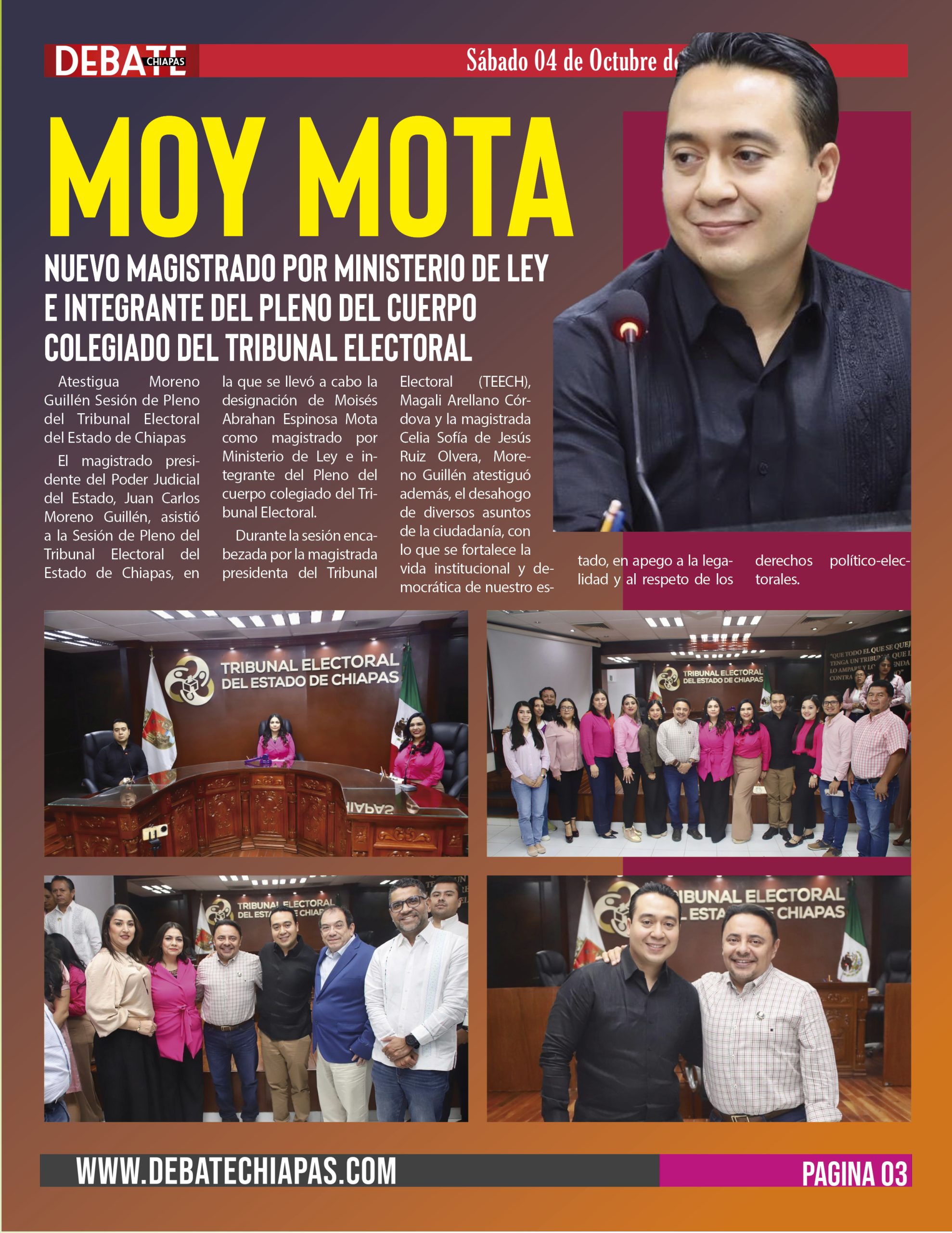 El magistrado presidente del Poder Judicial del Estado, Juan Carlos Moreno Guillén, asistió a la Sesión de Pleno del Tribunal Electoral del Estado de Chiapas, en la que se llevó a cabo la designación de Moisés Abrahan Espinosa Mota como magistrado por Ministerio de Ley e integrante del Pleno del cuerpo colegiado del Tribunal Electoral.