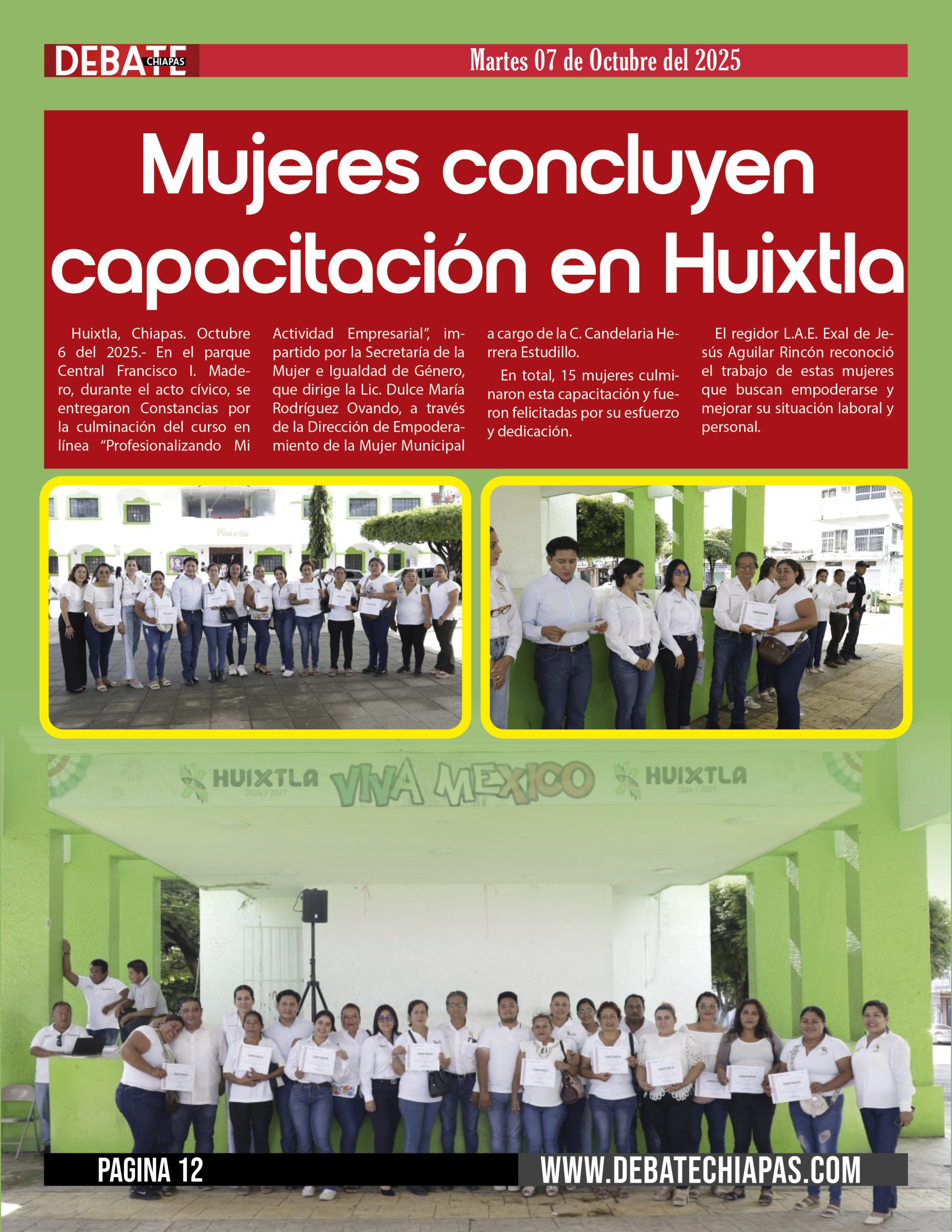 Huixtla, Chiapas. Octubre 6 del 2025.- En el parque Central Francisco I. Madero, durante el acto cívico, se entregaron Constancias por la culminación del curso en línea «Profesionalizando Mi Actividad Empresarial», impartido por la Secretaría de la Mujer e Igualdad de Género, que dirige la Lic. Dulce María Rodríguez Ovando, a través de la Dirección de Empoderamiento de la Mujer Municipal a cargo de la C. Candelaria Herrera Estudillo.