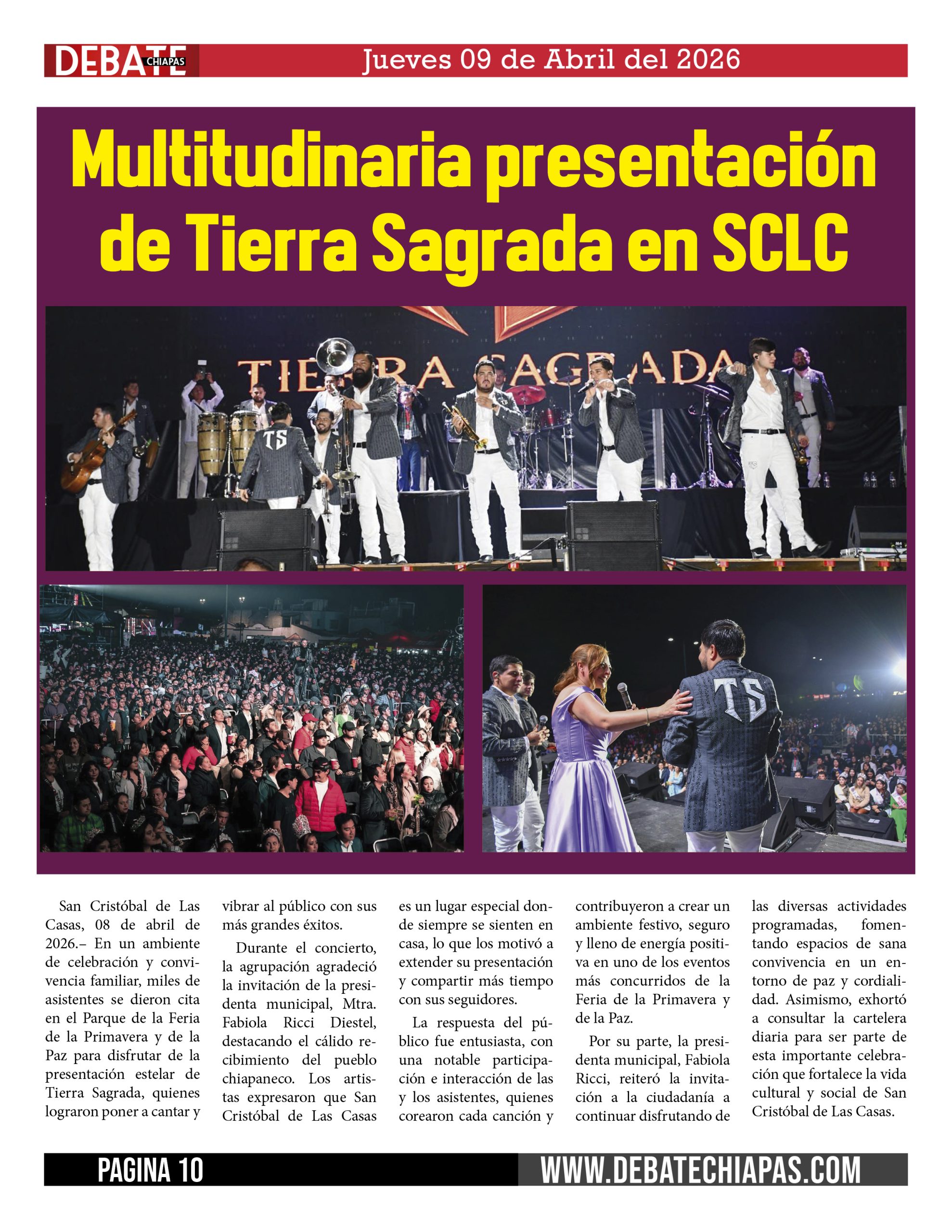 San Cristóbal de Las Casas, 08 de abril de 2026.– En un ambiente de celebración y convivencia familiar, miles de asistentes se dieron cita en el Parque de la Feria de la Primavera y de la Paz para disfrutar de la presentación estelar de Tierra Sagrada, quienes lograron poner a cantar y vibrar al público con sus más grandes éxitos.