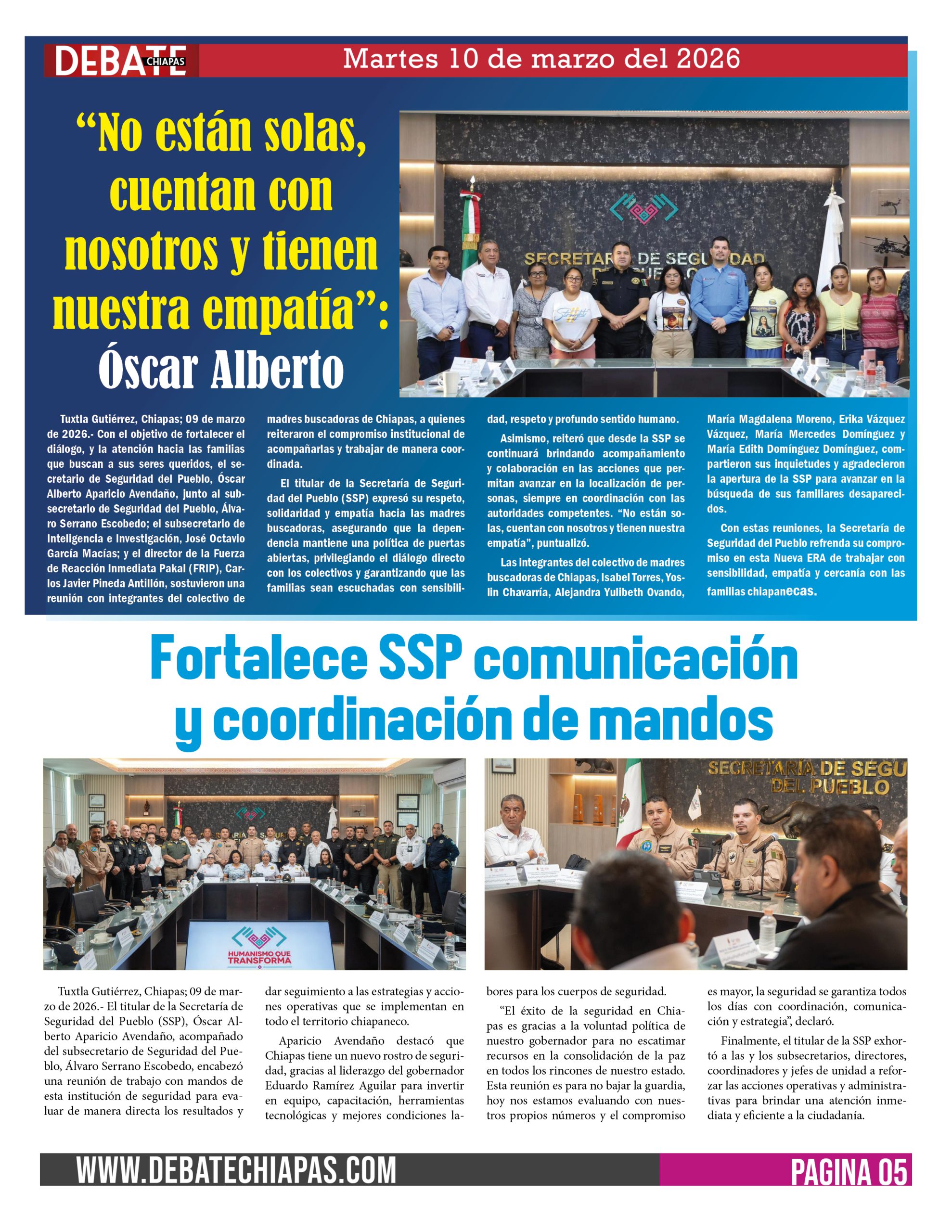 Tuxtla Gutiérrez, Chiapas; 09 de marzo de 2026.- Con el objetivo de fortalecer el diálogo, y la atención hacia las familias que buscan a sus seres queridos, el secretario de Seguridad del Pueblo, Óscar Alberto Aparicio Avendaño, junto al subsecretario de Seguridad del Pueblo, Álvaro Serrano Escobedo; el subsecretario de Inteligencia e Investigación, José Octavio García Macías; y el director de la Fuerza de Reacción Inmediata Pakal (FRIP), Carlos Javier Pineda Antillón, sostuvieron una reunión con integrantes del colectivo de madres buscadoras de Chiapas, a quienes reiteraron el compromiso institucional de acompañarlas y trabajar de manera coordinada.
