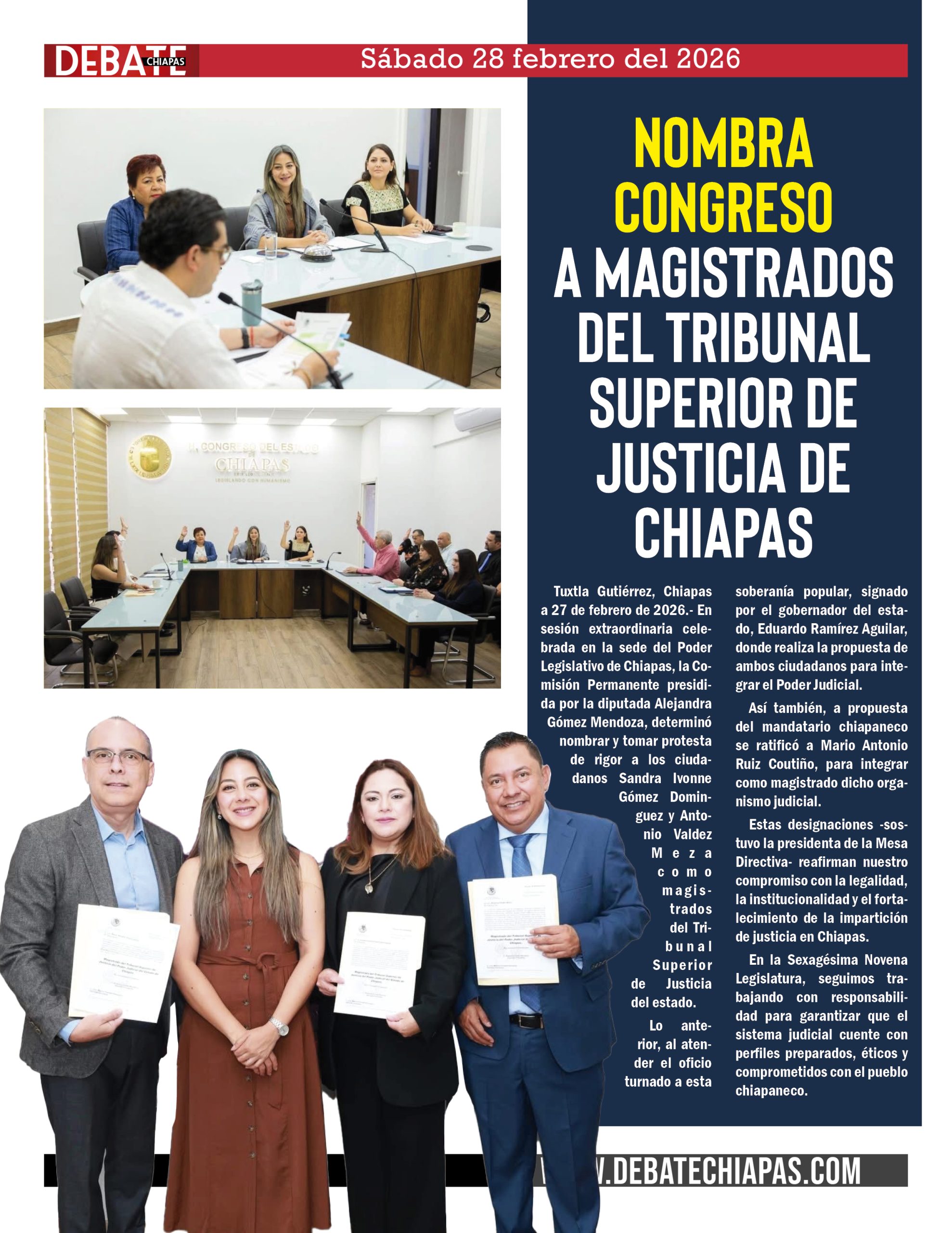 Tuxtla Gutiérrez, Chiapas a 27 de febrero de 2026.- En sesión  extraordinaria celebrada en  la sede del Poder Legislativo de Chiapas, la Comisión Permanente presidida por la diputada Alejandra Gómez Mendoza, determinó nombrar y tomar protesta de rigor a los ciudadanos Sandra Ivonne Gómez Dominguez y Antonio Valdez Meza como  magistrados del Tribunal Superior de Justicia del estado.