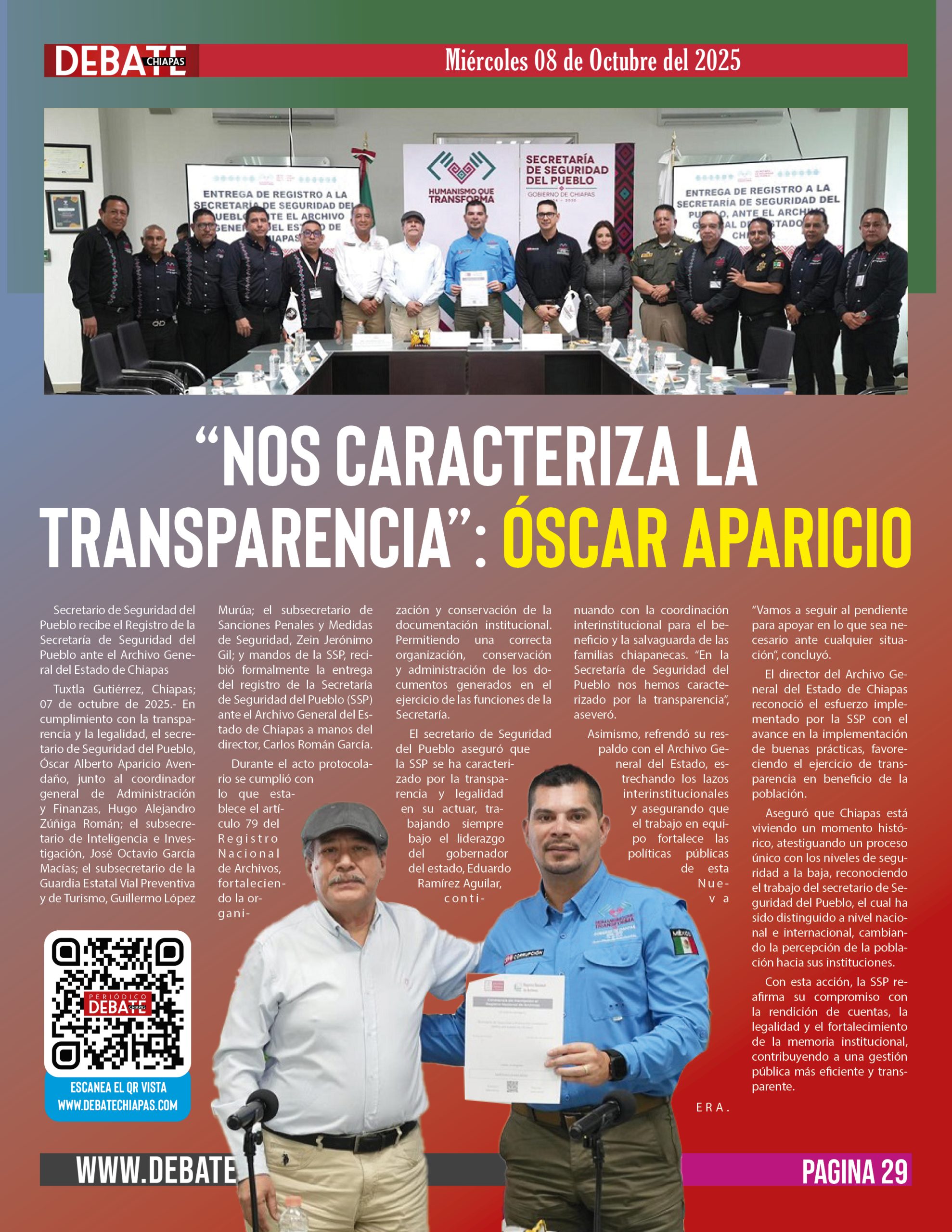 Tuxtla Gutiérrez, Chiapas; 07 de octubre de 2025.- En cumplimiento con la transparencia y la legalidad, el secretario de Seguridad del Pueblo, Óscar Alberto Aparicio Avendaño, junto al coordinador general de Administración y Finanzas, Hugo Alejandro Zúñiga Román; el subsecretario de Inteligencia e Investigación, José Octavio García Macías; el subsecretario de la Guardia Estatal Vial Preventiva y de Turismo, Guillermo López Murúa; el subsecretario de Sanciones Penales y Medidas de Seguridad, Zein Jerónimo Gil; y mandos de la SSP, recibió formalmente la entrega del registro de la Secretaría de Seguridad del Pueblo (SSP) ante el Archivo General del Estado de Chiapas a manos del director, Carlos Román García.