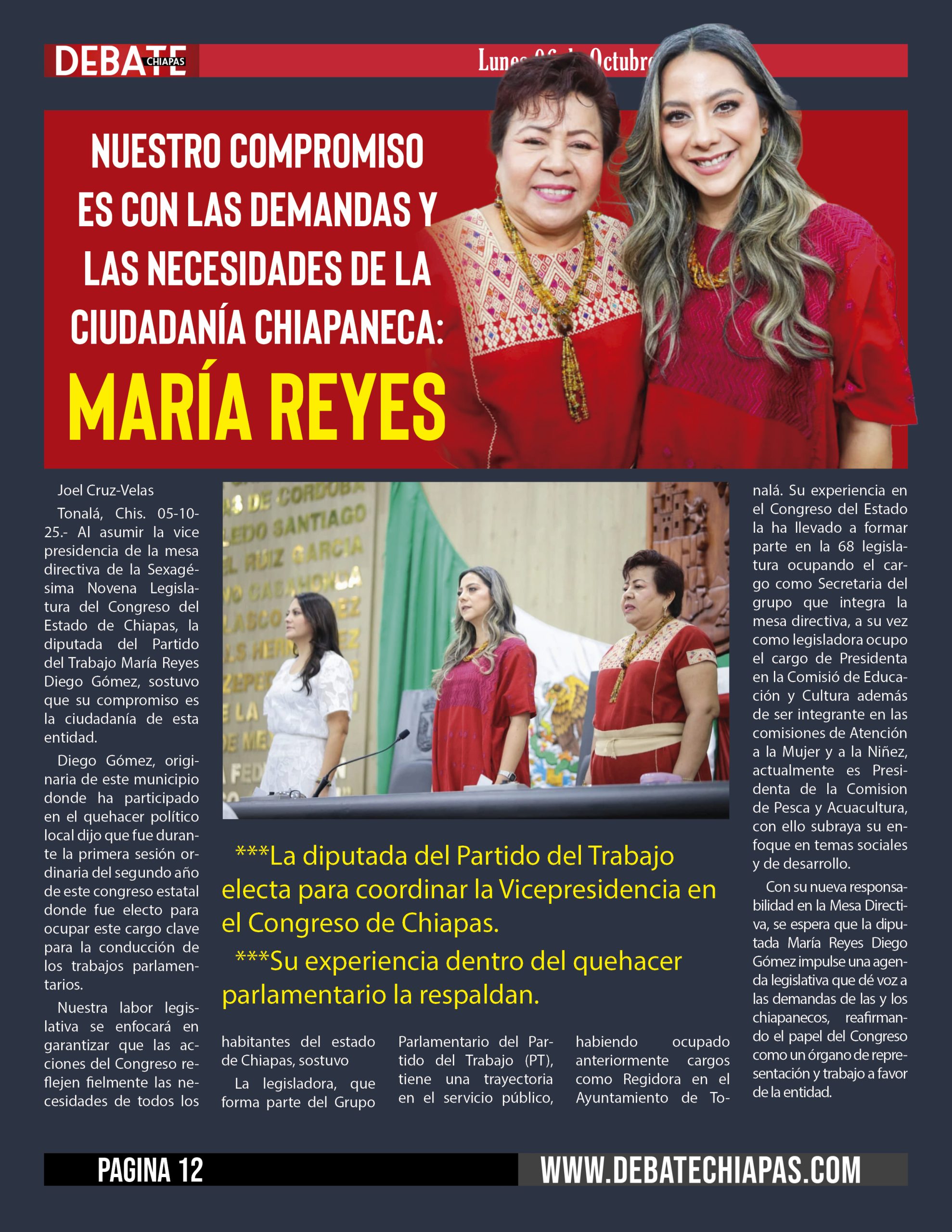 Tonalá, Chis. 05-10-25.- Al asumir la vice presidencia de la mesa directiva de la Sexagésima Novena Legislatura del Congreso del Estado de Chiapas, la diputada del Partido del Trabajo María Reyes Diego Gómez, sostuvo que su compromiso es la ciudadanía de esta entidad.
