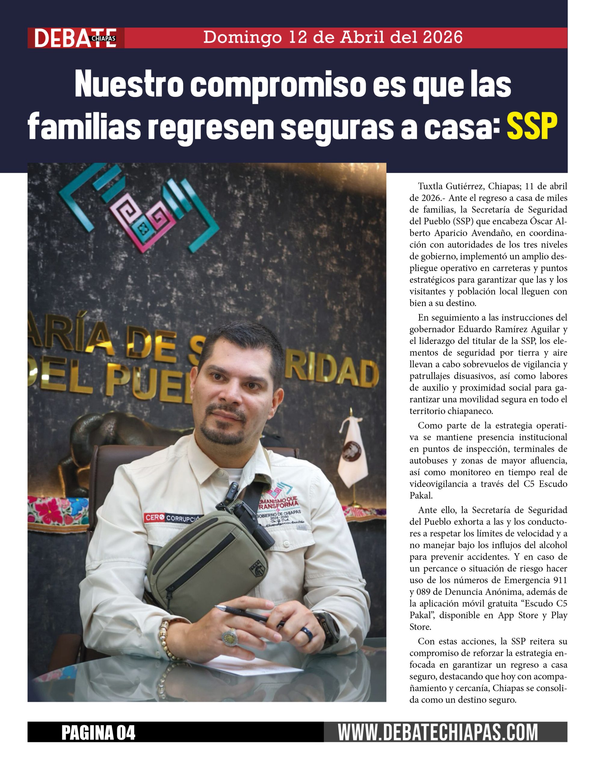 Tuxtla Gutiérrez, Chiapas; 11 de abril de 2026.- Ante el regreso a casa de miles de familias, la Secretaría de Seguridad del Pueblo (SSP) que encabeza Óscar Alberto Aparicio Avendaño, en coordinación con autoridades de los tres niveles de gobierno, implementó un amplio despliegue operativo en carreteras y puntos estratégicos para garantizar que las y los visitantes y población local lleguen con bien a su destino.