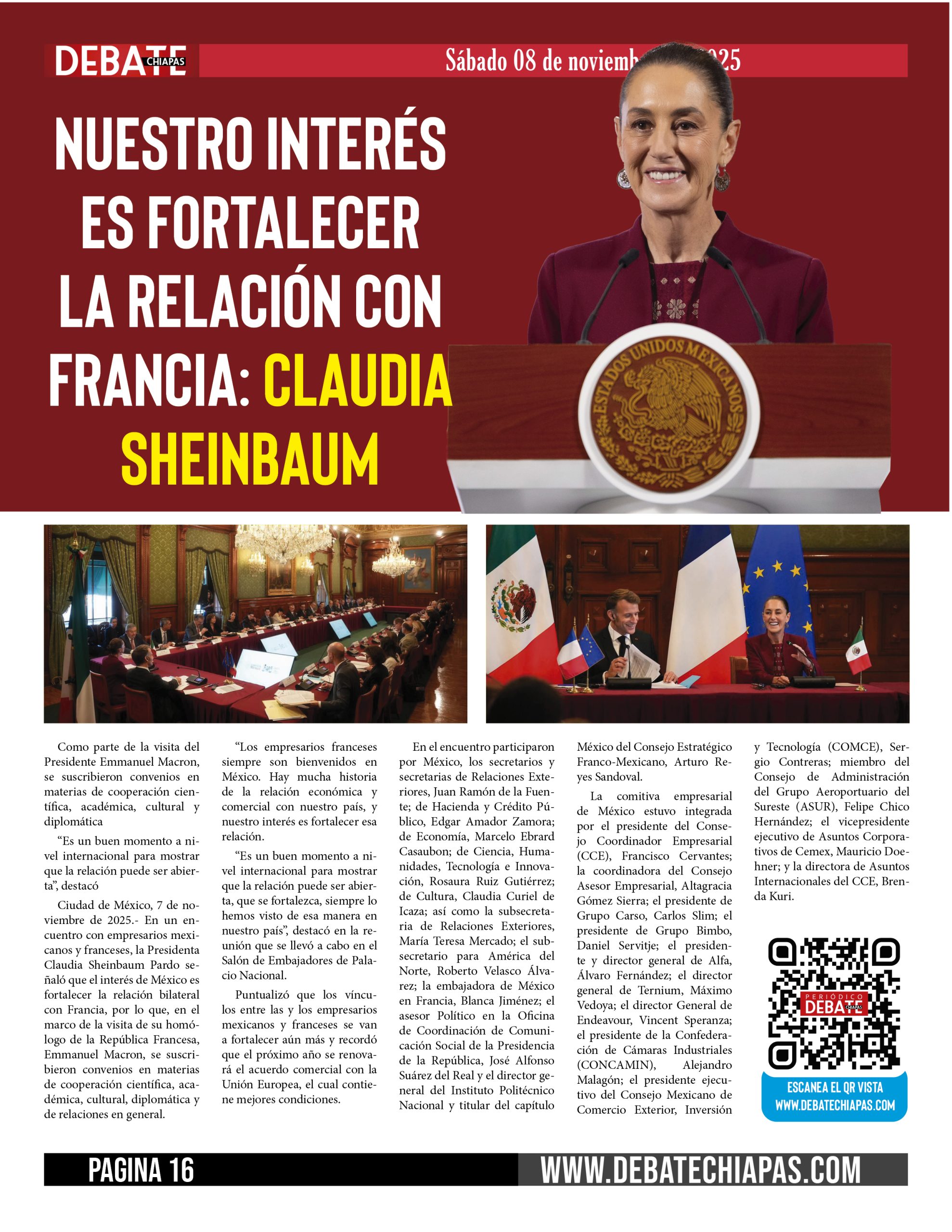 Ciudad de México, 7 de noviembre de 2025.- En un encuentro con empresarios mexicanos y franceses, la Presidenta Claudia Sheinbaum Pardo señaló que el interés de México es fortalecer la relación bilateral con Francia, por lo que, en el marco de la visita de su homólogo de la República Francesa, Emmanuel Macron, se suscribieron convenios en materias de cooperación científica, académica, cultural, diplomática y de relaciones en general.