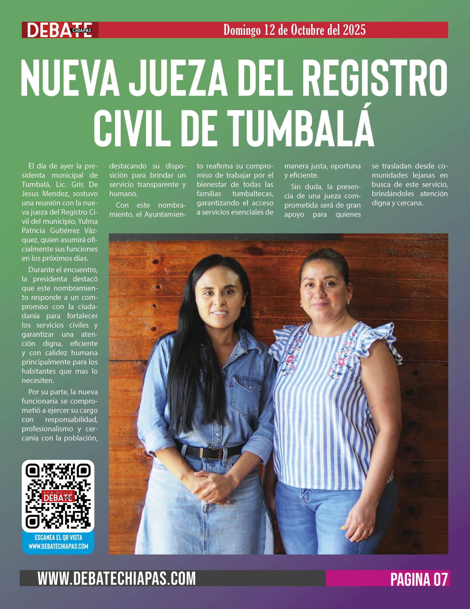 El día de ayer la presidenta municipal de Tumbalá, Lic. Gris De Jesus Mendez, sostuvo una reunión con la nueva jueza del Registro Civil del municipio, Yulma Patricia Gutiérrez Vázquez, quien asumirá oficialmente sus funciones en los próximos días.