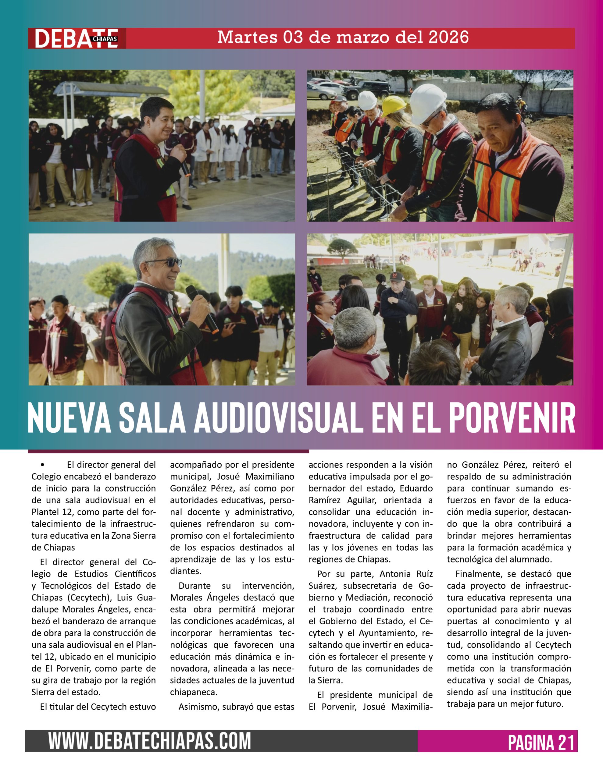 El director general del Colegio de Estudios Científicos y Tecnológicos del Estado de Chiapas (Cecytech), Luis Guadalupe Morales Ángeles, encabezó el banderazo de arranque de obra para la construcción de una sala audiovisual en el Plantel 12, ubicado en el municipio de El Porvenir, como parte de su gira de trabajo por la región Sierra del estado.