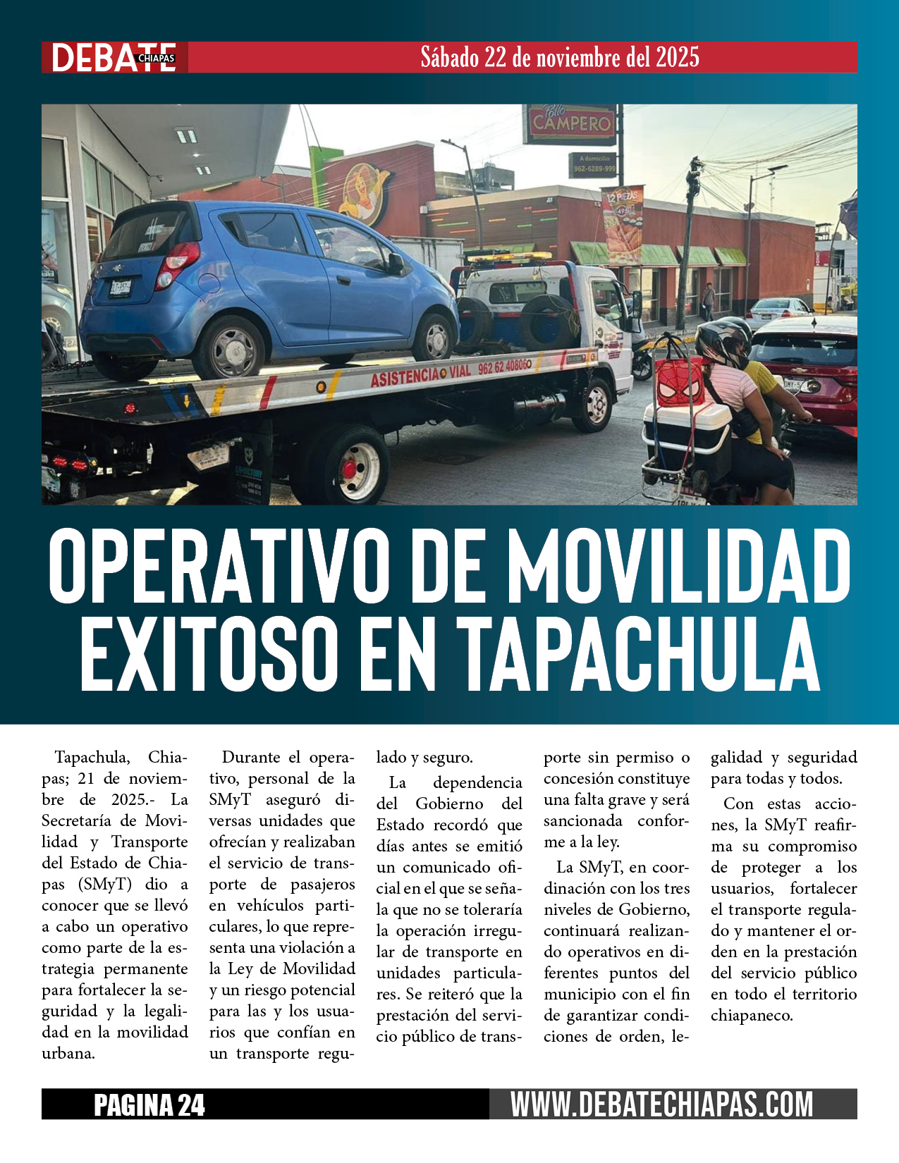 Tapachula, Chiapas; 21 de noviembre de 2025.- La Secretaría de Movilidad y Transporte del Estado de Chiapas (SMyT) dio a conocer que se llevó a cabo un operativo como parte de la estrategia permanente para fortalecer la seguridad y la legalidad en la movilidad urbana.