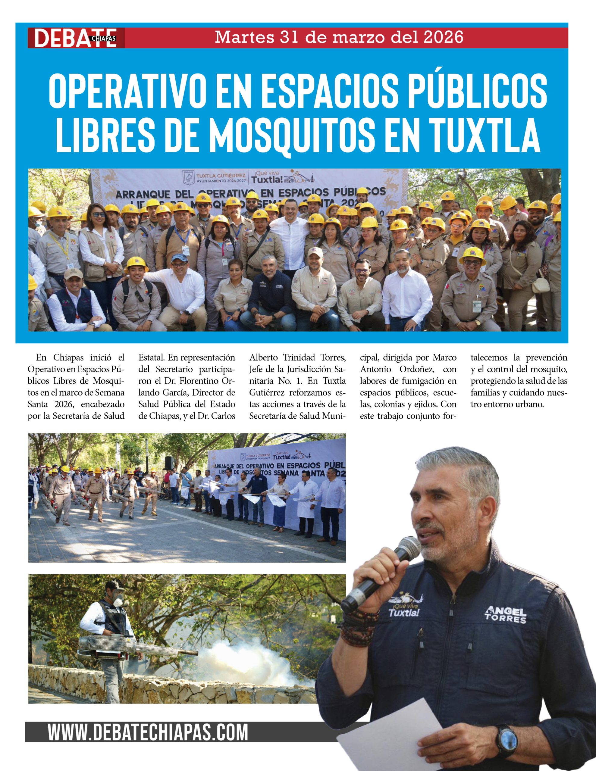 En Chiapas inició el Operativo en Espacios Públicos Libres de Mosquitos en el marco de Semana Santa 2026, encabezado por la Secretaría de Salud Estatal. En representación del Secretario participaron el Dr. Florentino Orlando García, Director de Salud Pública del Estado de Chiapas, y el Dr. Carlos Alberto Trinidad Torres, Jefe de la Jurisdicción Sanitaria No. 1. En Tuxtla Gutiérrez reforzamos estas acciones a través de la Secretaría de Salud Municipal, dirigida por Marco Antonio Ordoñez, con labores de fumigación en espacios públicos, escuelas, colonias y ejidos. Con este trabajo conjunto fortalecemos la prevención y el control del mosquito, protegiendo la salud de las familias y cuidando nuestro entorno urbano.
