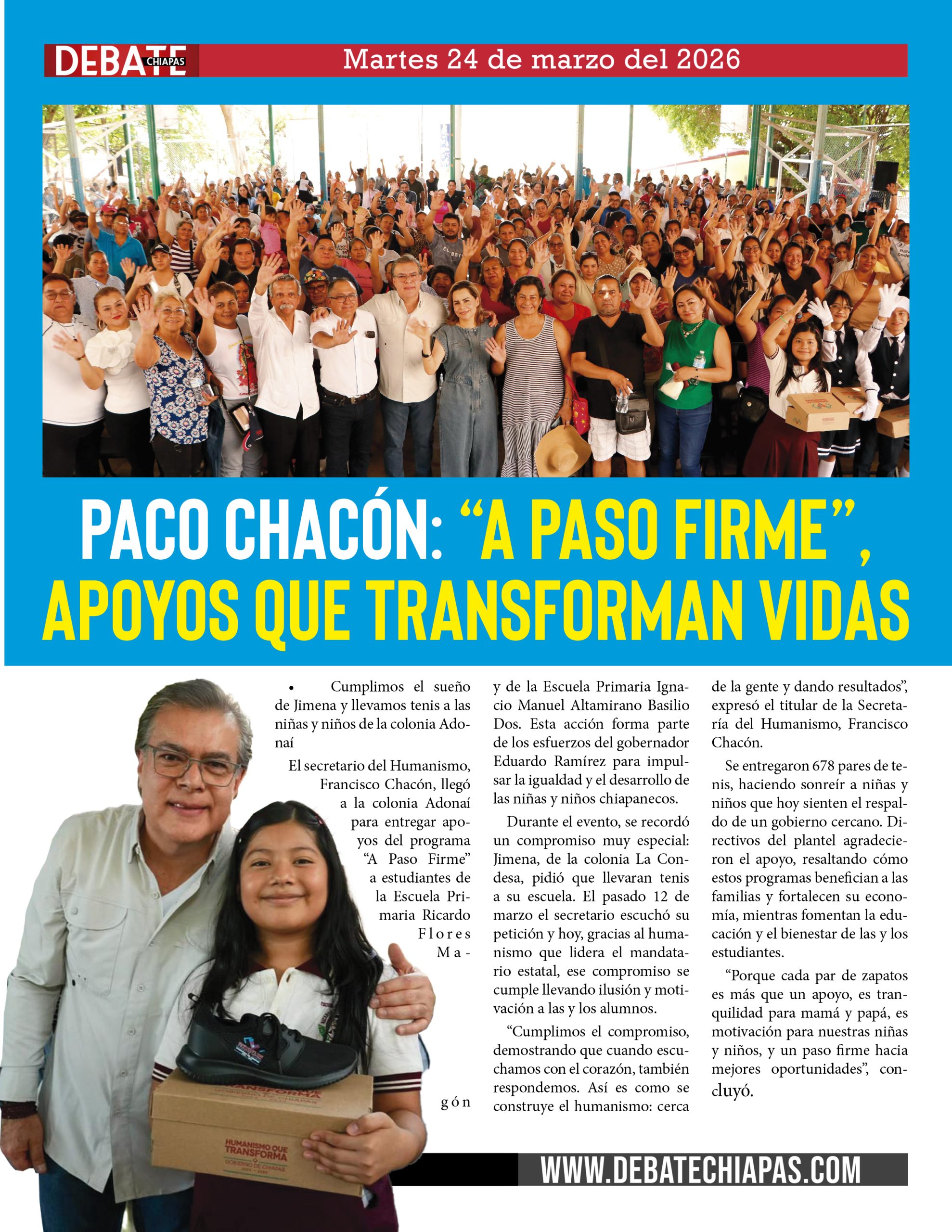 El secretario del Humanismo, Francisco Chacón, llegó a la colonia Adonaí para entregar apoyos del programa “A Paso Firme” a estudiantes de la Escuela Primaria Ricardo Flores Magón y de la Escuela Primaria Ignacio Manuel Altamirano Basilio Dos. Esta acción forma parte de los esfuerzos del gobernador Eduardo Ramírez para impulsar la igualdad y el desarrollo de las niñas y niños chiapanecos.