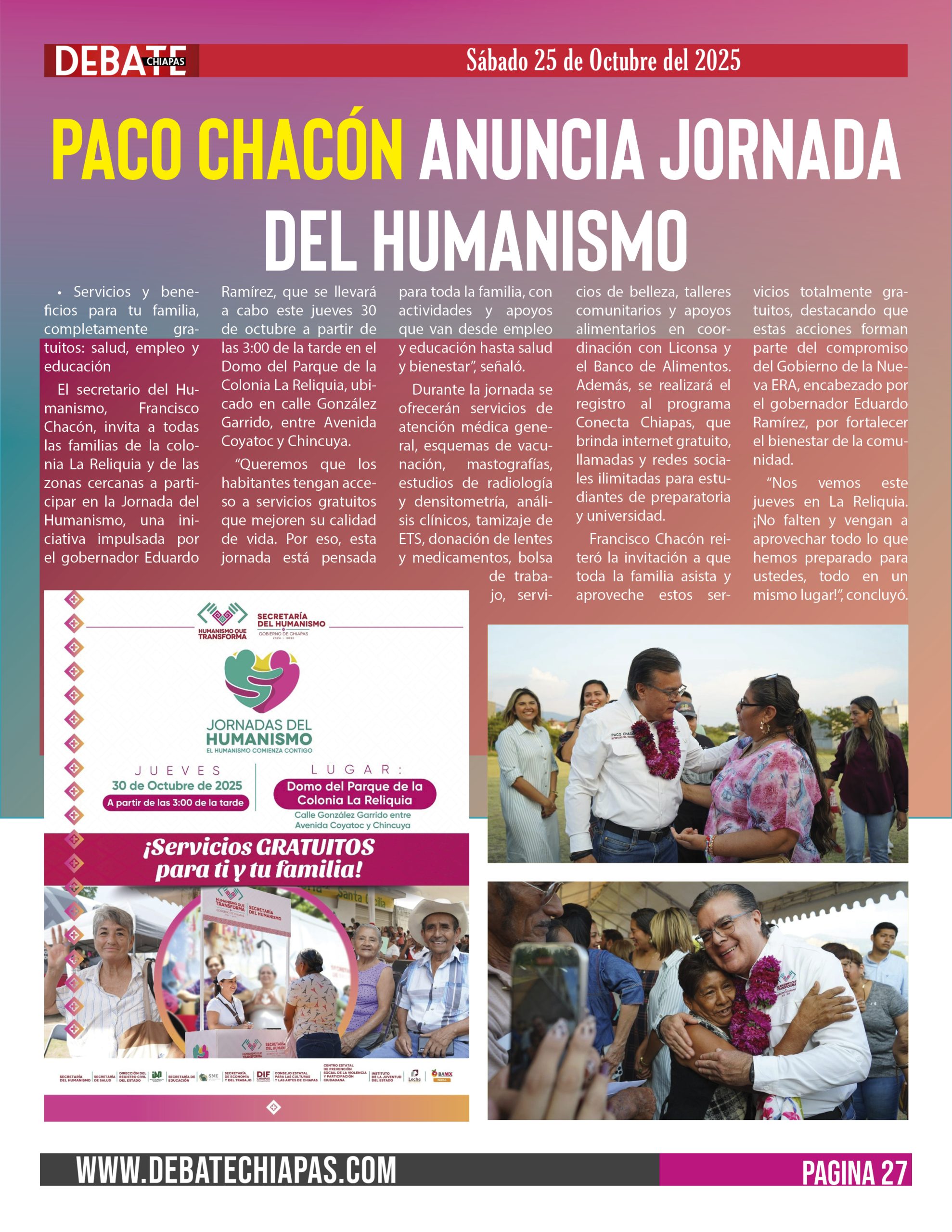 El secretario del Humanismo, Francisco Chacón, invita a todas las familias de la colonia La Reliquia y de las zonas cercanas a participar en la Jornada del Humanismo, una iniciativa impulsada por el gobernador Eduardo Ramírez, que se llevará a cabo este jueves 30 de octubre a partir de las 3:00 de la tarde en el Domo del Parque de la Colonia La Reliquia, ubicado en calle González Garrido, entre Avenida Coyatoc y Chincuya.