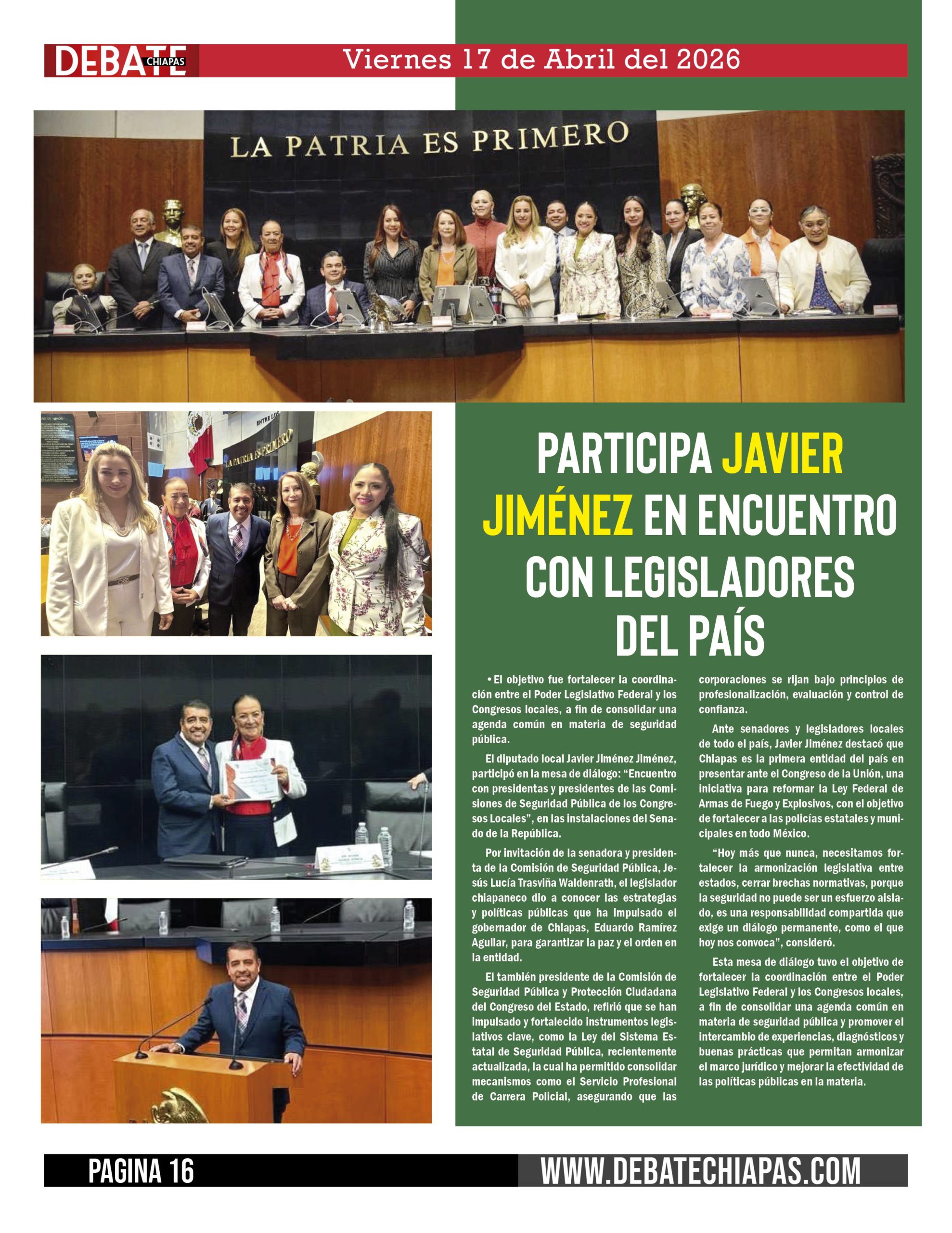 Por invitación de la senadora y presidenta de la Comisión de Seguridad Pública, Jesús Lucía Trasviña Waldenrath, el legislador chiapaneco dio a conocer las estrategias y políticas públicas que ha impulsado el gobernador de Chiapas, Eduardo Ramírez Aguilar, para garantizar la paz y el orden en la entidad.