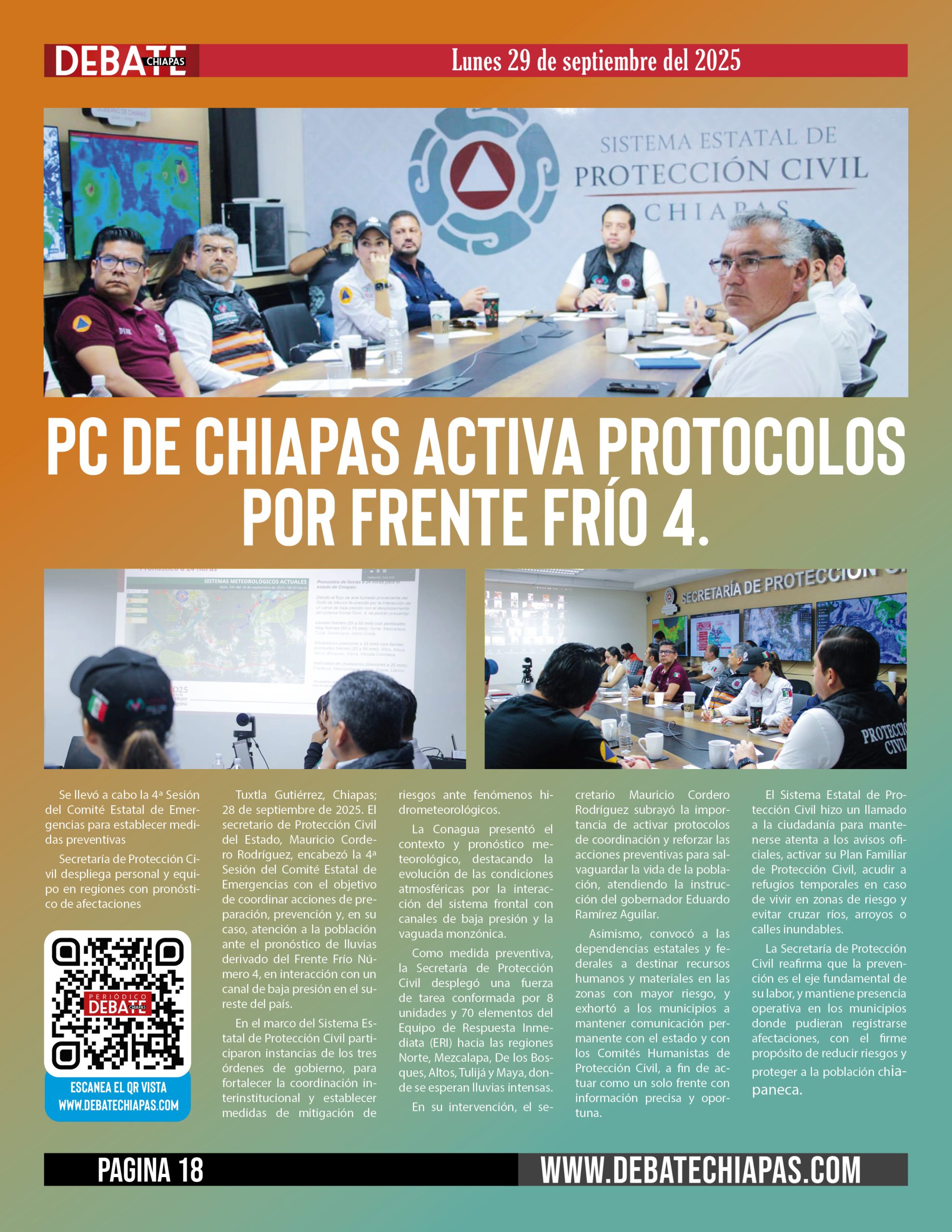 Tuxtla Gutiérrez, Chiapas; 28 de septiembre de 2025. El secretario de Protección Civil del Estado, Mauricio Cordero Rodríguez, encabezó la 4ª Sesión del Comité Estatal de Emergencias con el objetivo de coordinar acciones de preparación, prevención y, en su caso, atención a la población ante el pronóstico de lluvias derivado del Frente Frío Número 4, en interacción con un canal de baja presión en el sureste del país.
