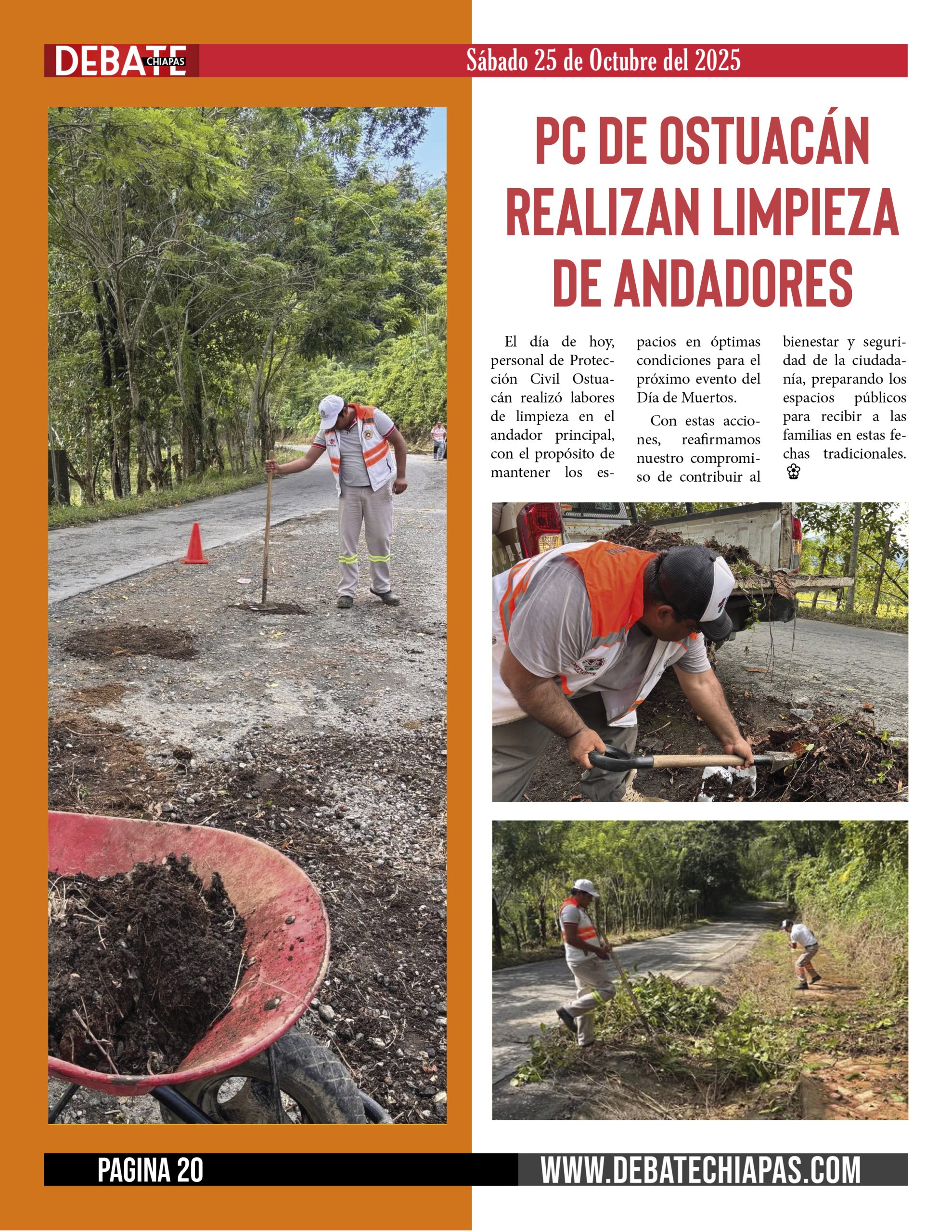 El día de hoy, personal de Protección Civil Ostuacán realizó labores de limpieza en el andador principal, con el propósito de mantener los espacios en óptimas condiciones para el próximo evento del Día de Muertos.