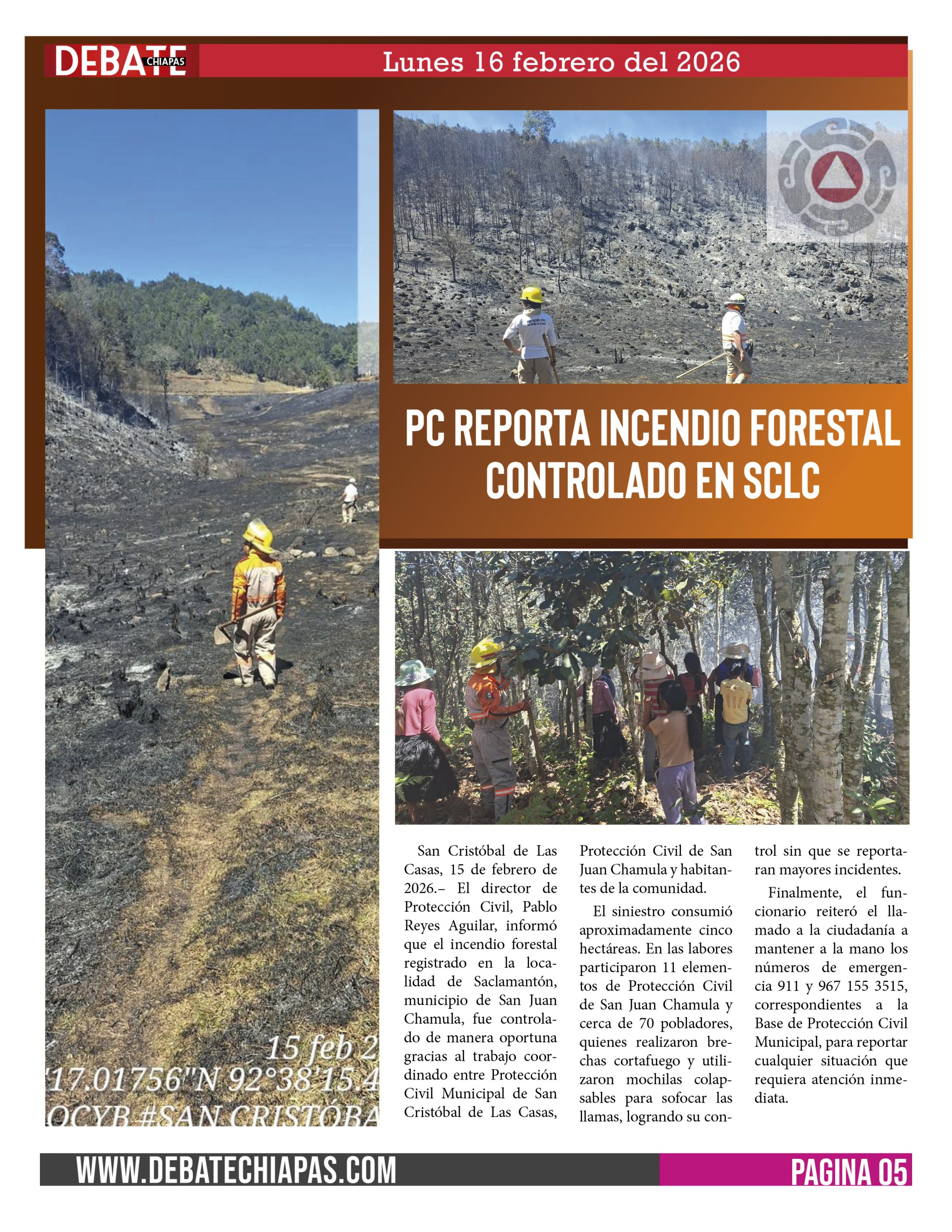San Cristóbal de Las Casas, 15 de febrero de 2026.– El director de Protección Civil, Pablo Reyes Aguilar, informó que el incendio forestal registrado en la localidad de Saclamantón, municipio de San Juan Chamula, fue controlado de manera oportuna gracias al trabajo coordinado entre Protección Civil Municipal de San Cristóbal de Las Casas, Protección Civil de San Juan Chamula y habitantes de la comunidad.