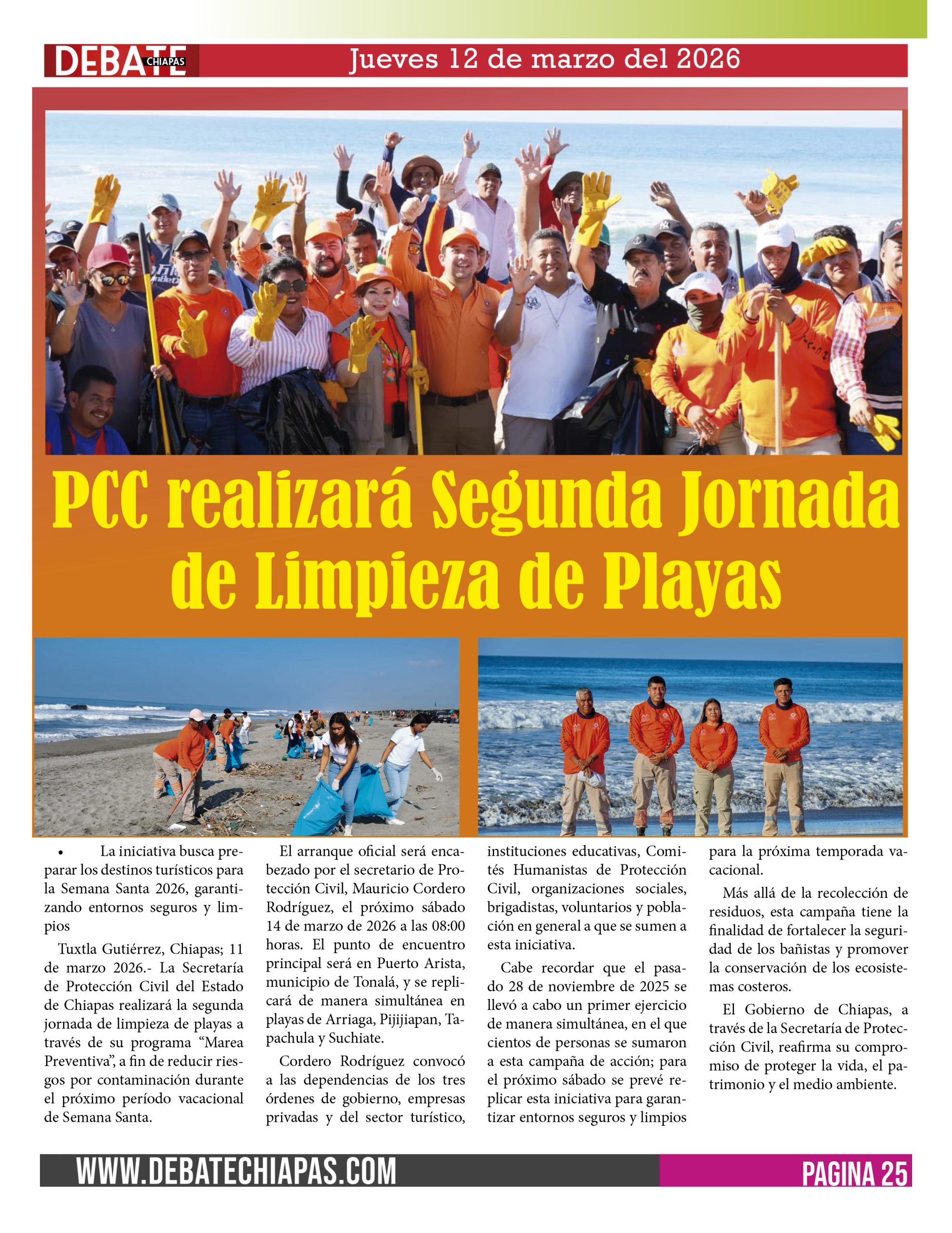 Tuxtla Gutiérrez, Chiapas; 11 de marzo 2026.- La Secretaría de Protección Civil del Estado de Chiapas realizará la segunda jornada de limpieza de playas a través de su programa “Marea Preventiva”, a fin de reducir riesgos por contaminación durante el próximo período vacacional de Semana Santa.